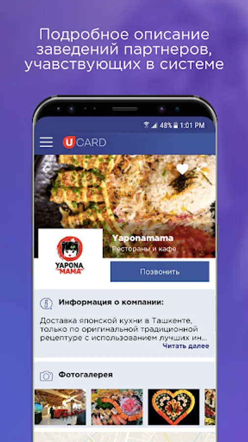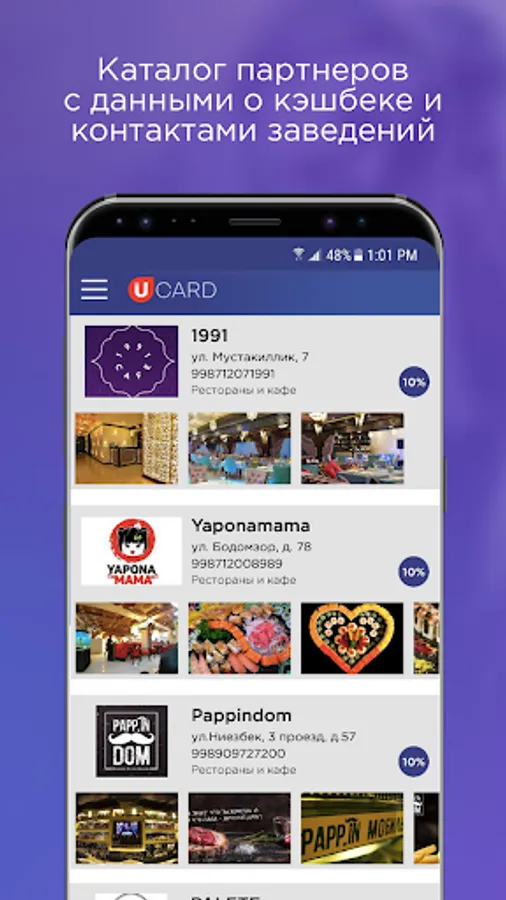 UCARD mobile app allows you to earn on their purchases and accumulate bonuses to various institutions, be they restaurants or cafes, pharmacies and shops, training centers or courses, fitness room or SPA salons, booking office or taxi service.