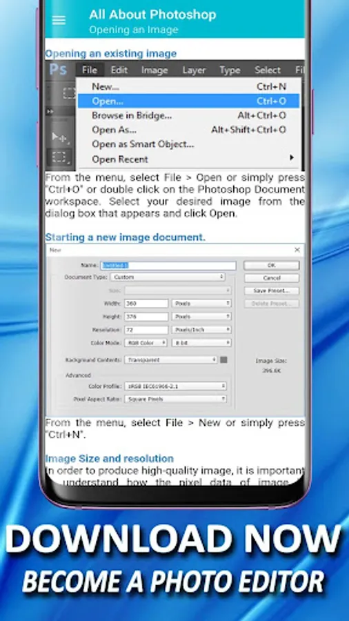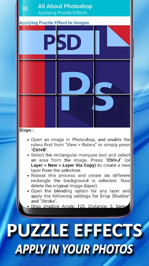 You can follow the steps provided within the app for Photoshop cs, cs2, cs3, cs4, cs5, cs6, and cc we have included every version and apply tips and tricks to edit your photo using Adobe Photoshop.