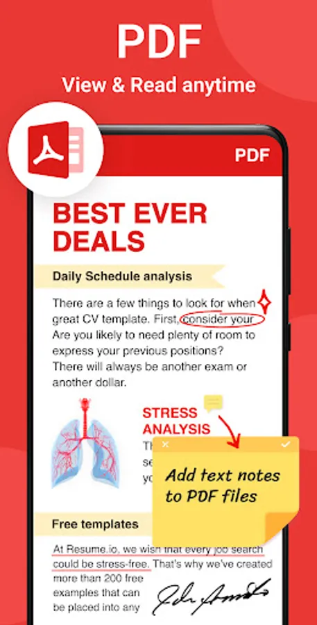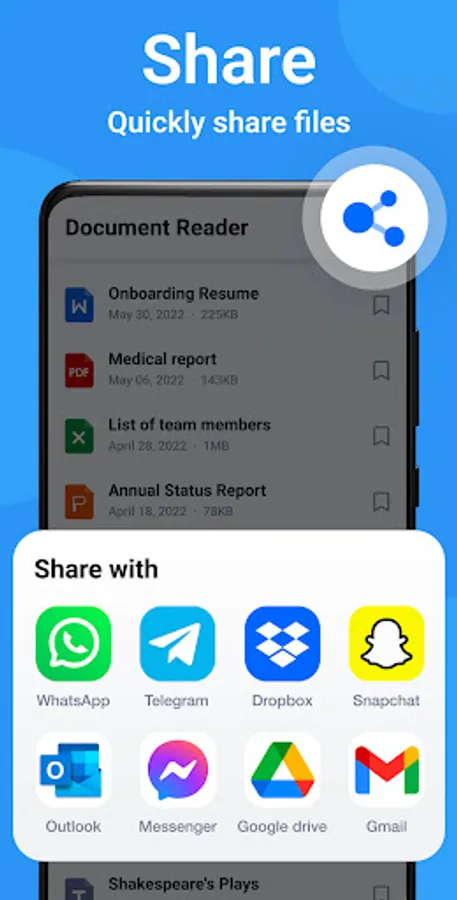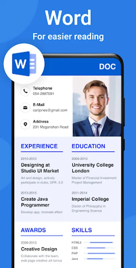 Document Reader is an all-in-one file viewer that helps you read and manage all formats of office files easily. PDF, WORD, EXCEL, PPT, TXT, etc. all supported.