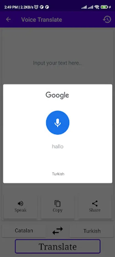 Catalan to Turkish translator allows users to speak and translate voice to text (voice typing). Then the automatic voice translator will quickly and accurately recognize the voice input by the user, translate directly into the language you set, and read the translation result aloud through the text-to-voice feature. This Feature to translate text from your voice like Turkish or Catalan also.also translate Catalan To Turkish And Turkish To Catalan through your voice.This Application Also given answer by Speak to Text Feature.Simply enter your desired text, and let Catalan Or Turkish words speak it aloud for you.You Can hear the proper pronunciation of Catalan words And Turkish words.it's helps to improve your Spoken Catalan And Turkish Both.Now you can sound like a native speaker too. Improve your vocabulary now!.