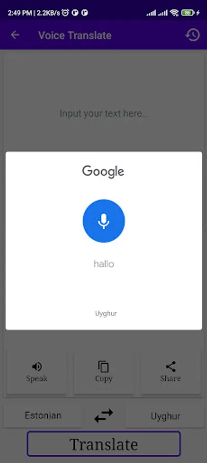 Estonian to Uyghur translator allows users to speak and translate voice to text (voice typing). Then the automatic voice translator will quickly and accurately recognize the voice input by the user, translate directly into the language you set, and read the translation result aloud through the text-to-voice feature. This Feature to translate text from your voice like Uyghur or Estonian also.also translate Estonian To Uyghur And Uyghur To Estonian through your voice.This Application Also given answer by Speak to Text Feature.Simply enter your desired text, and let Estonian Or Uyghur words speak it aloud for you.You Can hear the proper pronunciation of Estonian words And Uyghur words.it's helps to improve your Spoken Estonian And Uyghur Both.Now you can sound like a native speaker too. Improve your vocabulary now!.