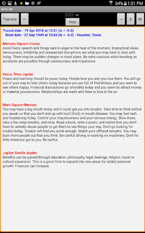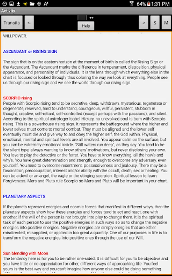"Natal Charts with Transits" is an astrology app that allows you to enter birth data and then generate a full natal report for that person. Also included are transit calculations and interpretations for that person, for any date of choice (these transit features are the same as found in my several Transits apps. In addition, you can also view a natal chartwheel or a transit-natal bi-wheel to see the actual astrological configurations. The app includes various settings so that you can customize the displays to your particular device. This app is a great way for beginners or intermediate astrology students to better learn the art of astrology - and use it to help make their lives better.