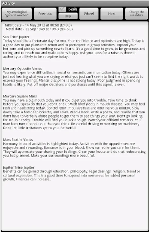 Transits for Tablets allows the user to check his individual planetary influences for any day past or present. A person's "general weather" forecast can be retrieved for any day, at any time. Transits is much more complete than any daily horoscope program as it is tailored to your specific birth date and time. Use Transits to learn more about how planetary energies influence you so that you can take steps to better "weather" anything that life throws at you. Astrology is the best tool for self-development and this program is real astrology.