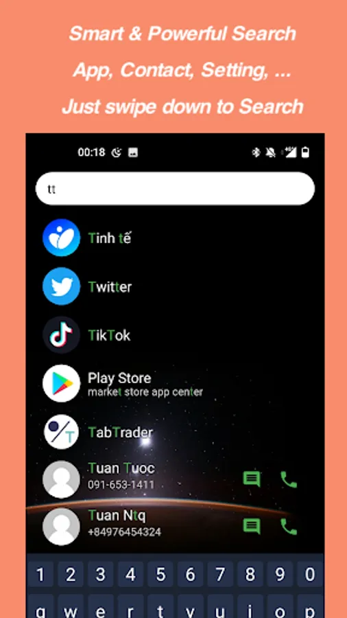 - Swipe down to search (App, Contact, Setting, Action , Shortcut , ...)