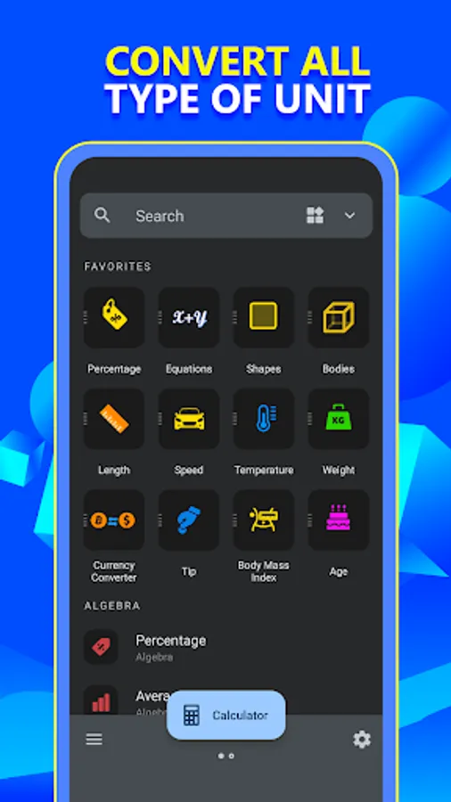 • Algebra, Geometry, Unit Converters, Finance, Health & Misc