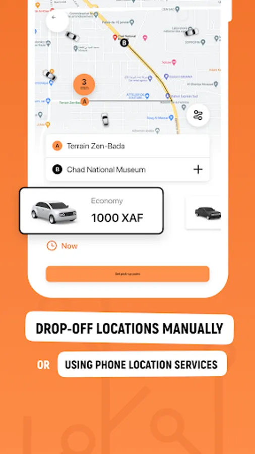 Allons-y is a Chad private taxi in N'djamena, Tchad. Allons-y helps users book a Chad private taxi for rides by entering pickup and drop-off locations manually or using phone location services in N'djamena, Tchad.