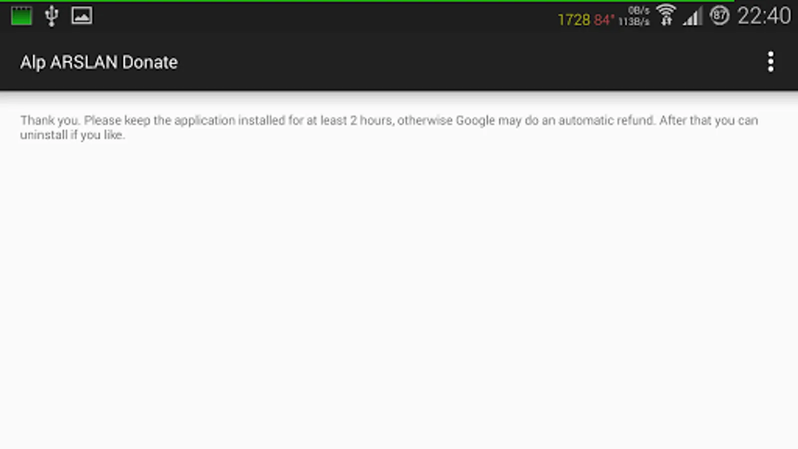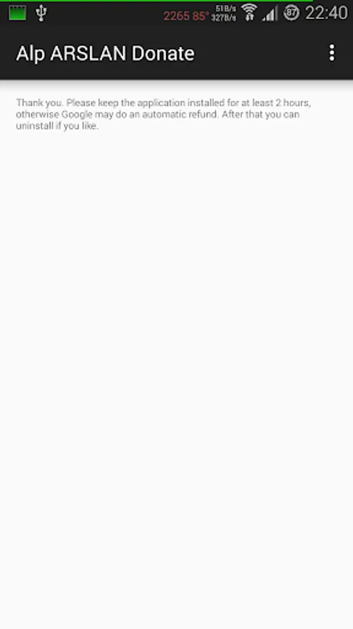 Please keep the donate app installed for at least 2 hours - otherwise Google may do an automatic refund.