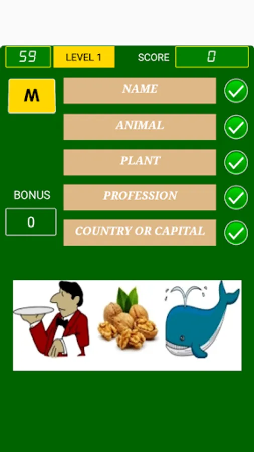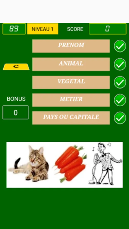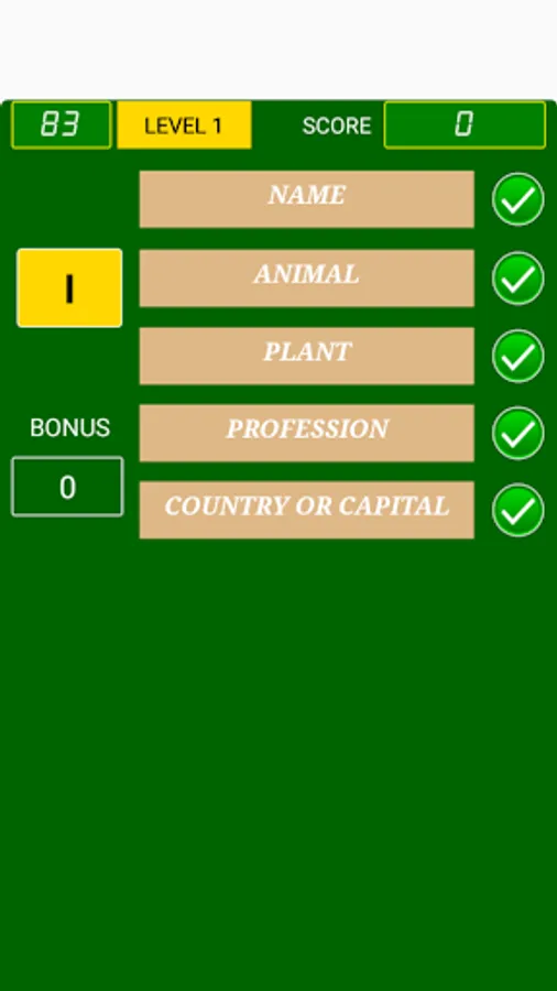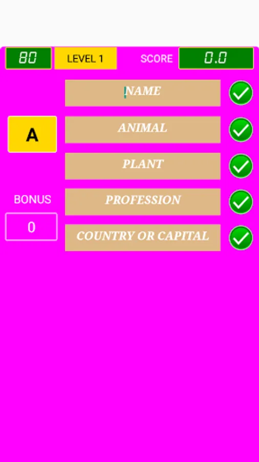 This game is not multiplayers game. Its objective is to fill five fields with words that commence with a chosen letter. These fields, in the first level, are: