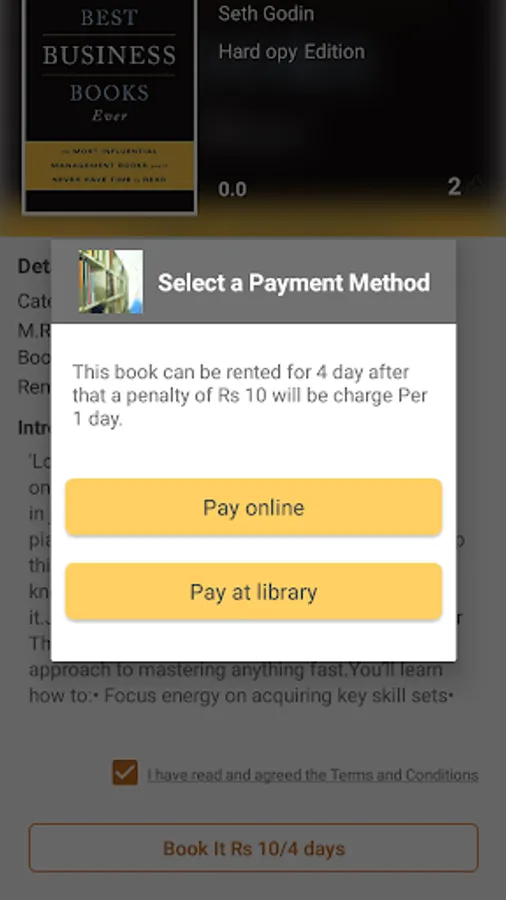 User can see different types of books with description,image & author. This app has lists of all the books, category wise available in the library. Users can place the rent order for books available. User has option to choose the payment option between "Pay the rent online" or "Pay at Library". Once the order is placed user can go to library and collect the book.