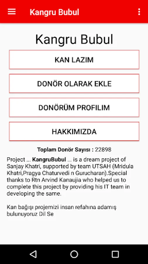 Kan Grubu Bul(Turkey) is an app based mode to find live donors for your patients. Every time and every where when you need blood, either the hospitals refuses to take blood from any particular blood bank or u don't get the proper blood group to match. With "Kan Grubu Bul" we are trying to introduce live donor to the needy patients, who is ready to donate blood as and when required Willingly. This way we can save many lives. The dream project of Sh. Sanjay Khatri of making "My City My Family" got completed with the other team members of UTSAH n active support of rotary club of Panchsheel park,rotary club pride n rotary club of Vasant valley New Delhi will have all the Citizens in One Family.