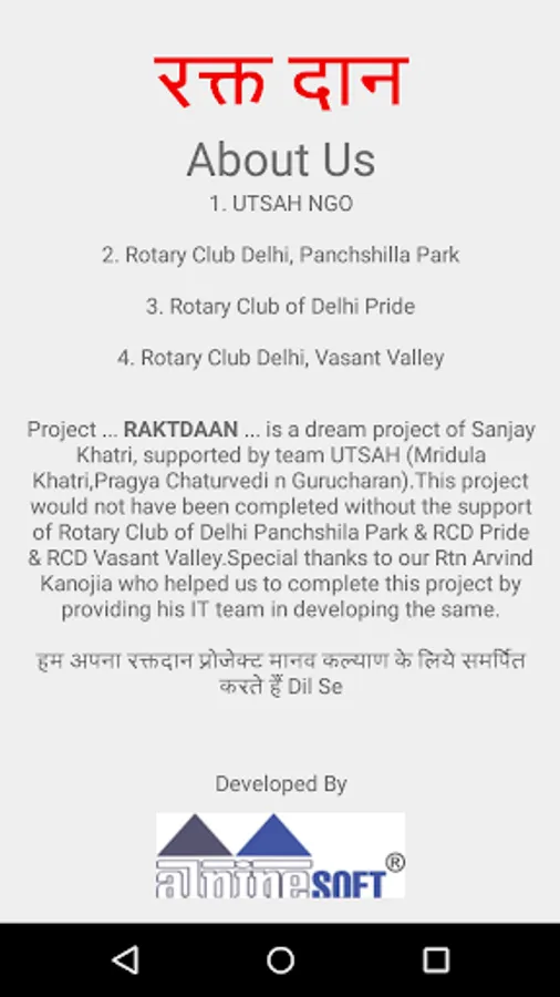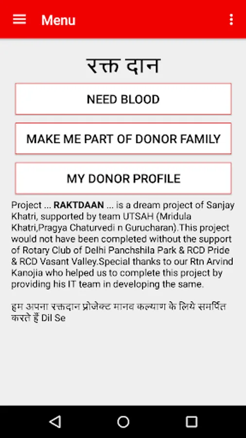 RaktDaan is an app based mode to find live donors for your patients. Every time and every where when you need blood, either the hospitals refuses to take blood from any particular blood bank or u don't get the proper blood group to match. With "RaktDaan" we are trying to introduce live donor to the needy patients, who is ready to donate blood as and when required Willingly. This way we can save many lives. The dream project of Sh. Sanjay Khatri of making "My City My Family" got completed with the other team members of UTSAH n active support of rotary club of Panchsheel park,rotary club pride n rotary club of Vasant valley New Delhi will have all the Citizens in One Family.