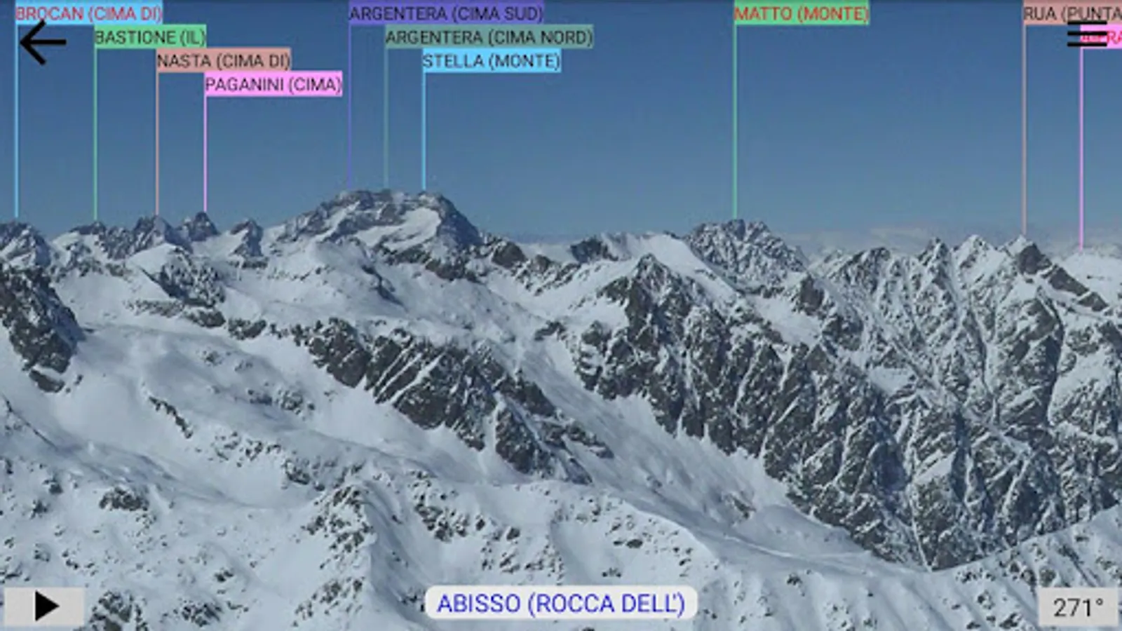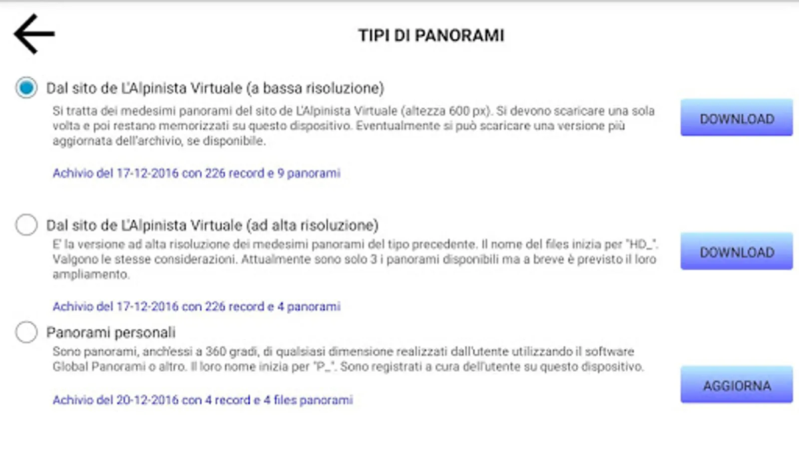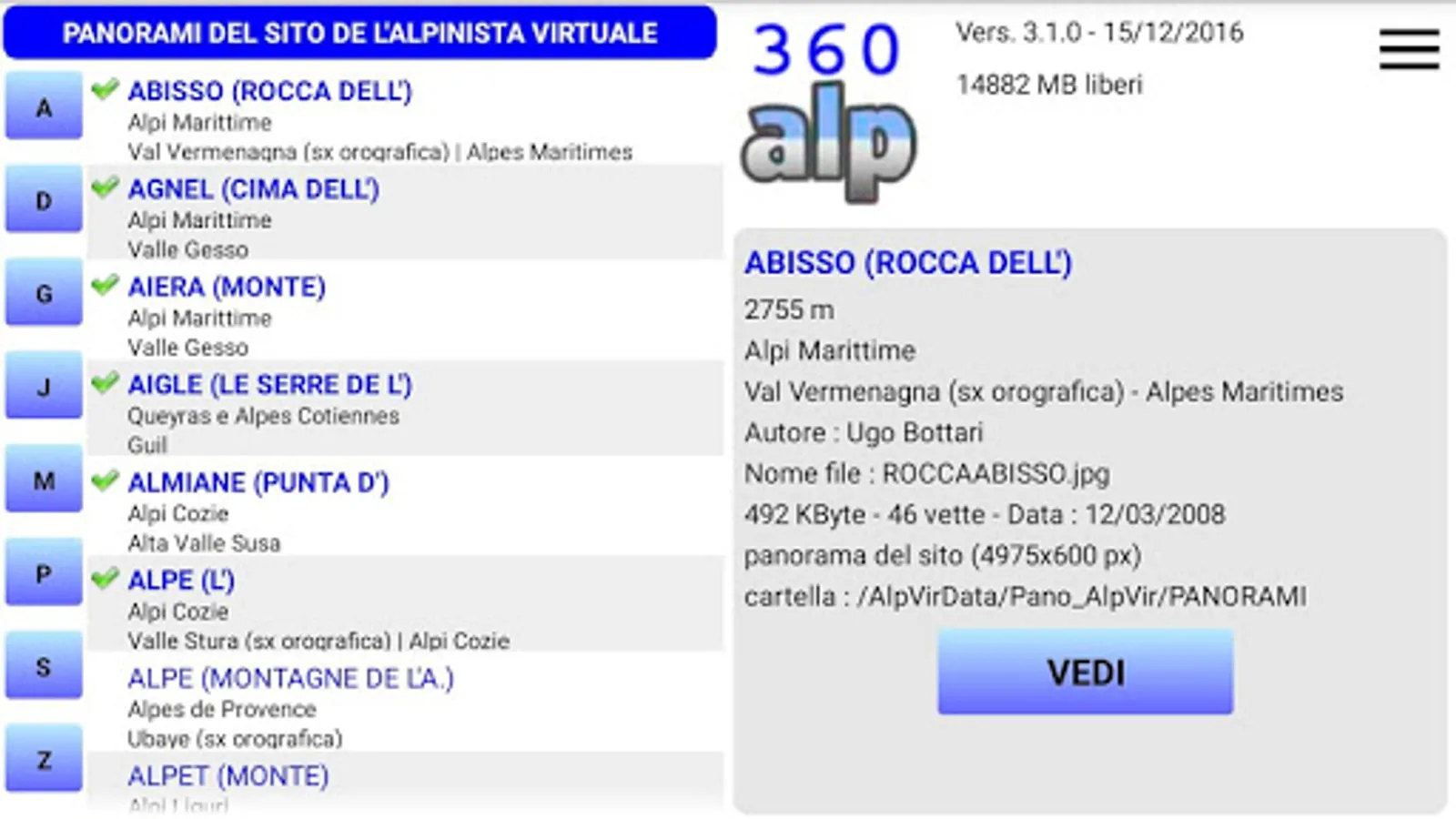 The app allows you to view 360 degree panoramas of the site of The Mountaineer Alerts (both low and high resolution) and even the "personal" user made. It also allows to realize the "synthetic" views with the indicated nimi of place names visible from a certain point. All this - very important - without being connected to the network, what this difficult if not impossible in the mountains.