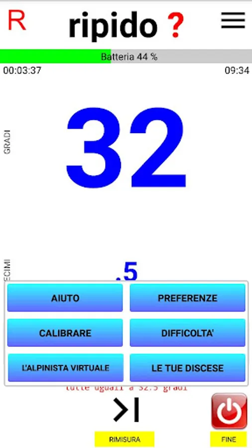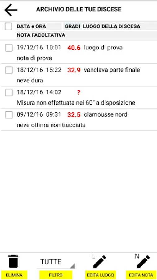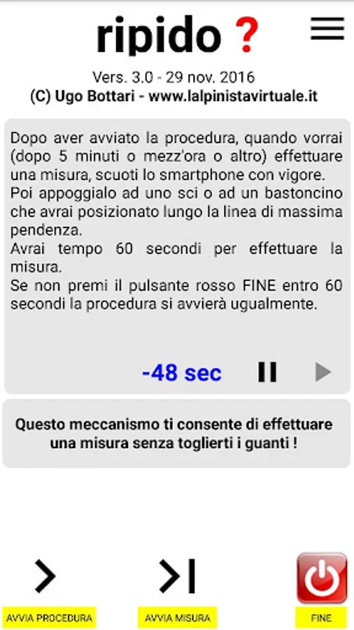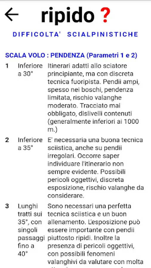 Measuring (with an original technique) the slope of a slope or channel while practicing extreme skiing and / or extreme. Can easily be used in particular conditions (ie during a descent or a very steep climb, with gloves and in precarious equilibrium conditions). To limit the app can also be used without removing the smartphone from its case. Another notable detail: records in an archive some data (including the slope) of your descents.