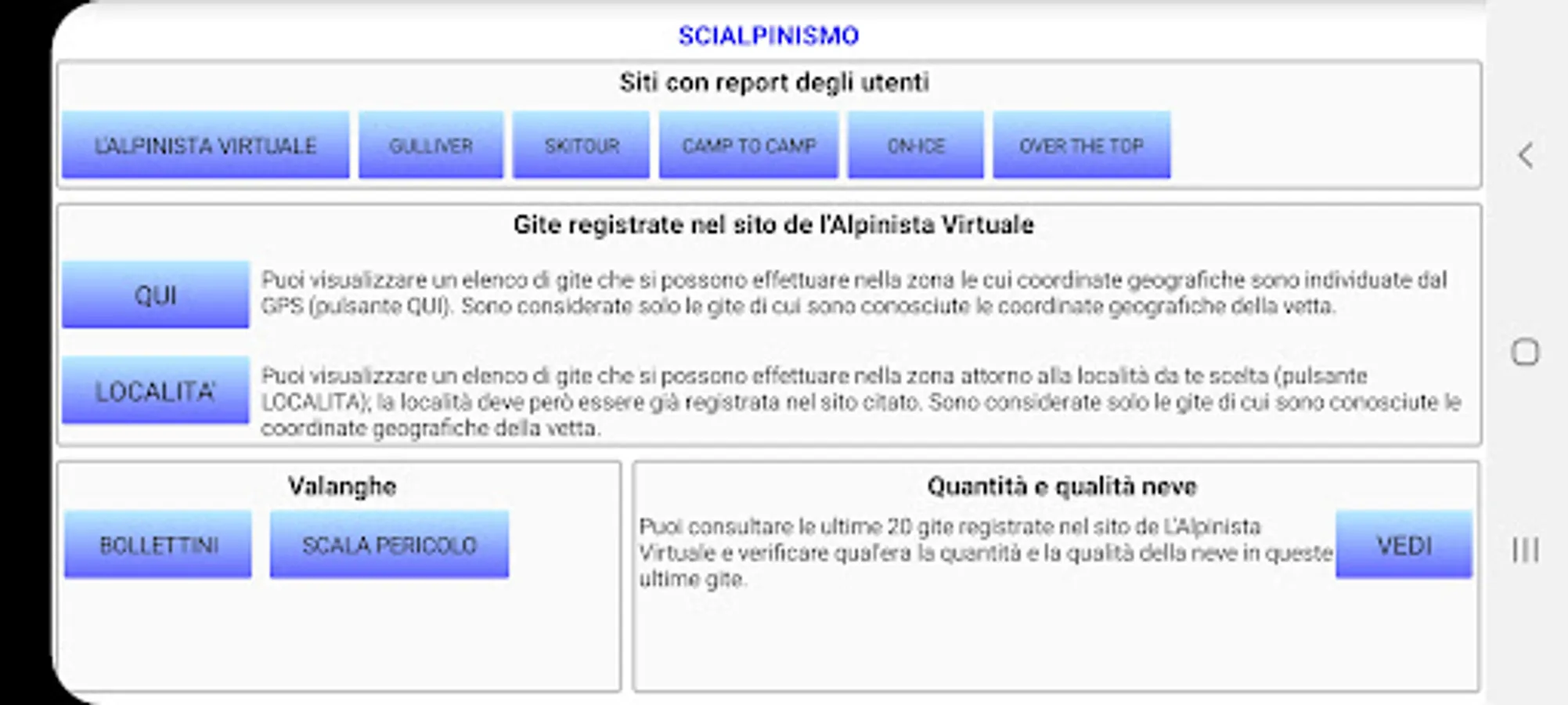 Other sections of the app consider useful material for ski mountaineering (tables, links to sites, various documentation, etc.).