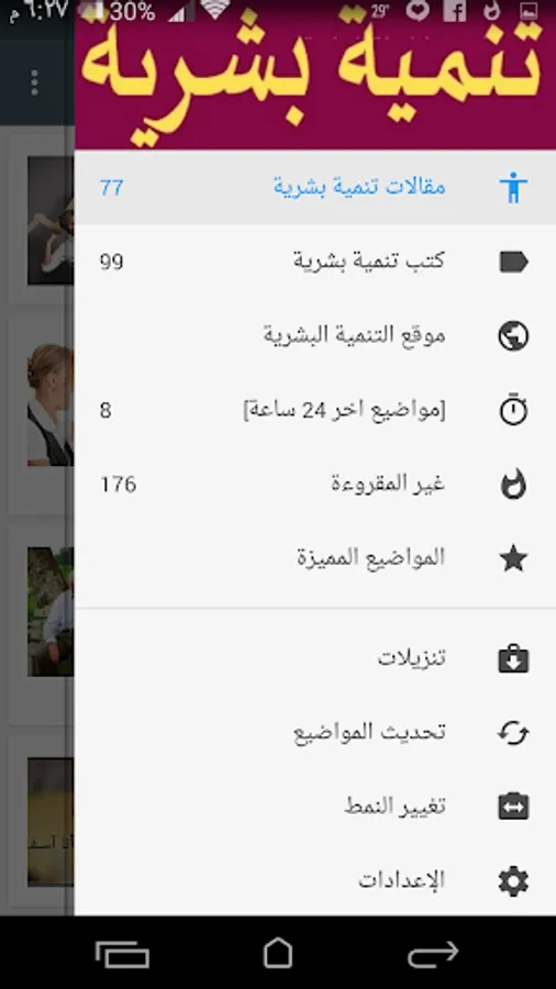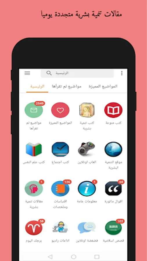 Articles of human and cultural development, summaries of books renewed daily, yoga, mental health, silver with an unknown, marital culture, raising various stories, various news and horoscope today, listening to various cultural radio broadcasts, personality testing, in addition to browsing the human development site, all in one application