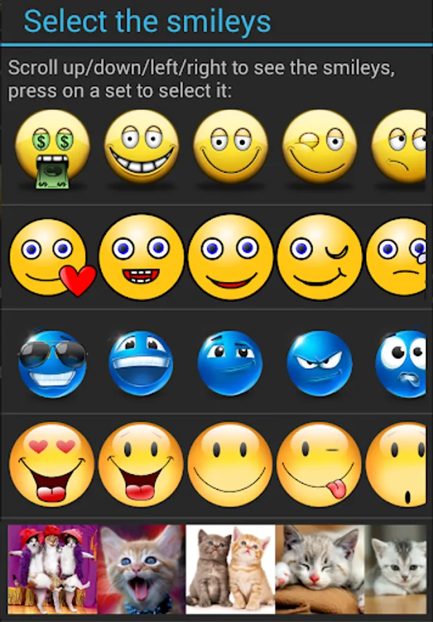 Tap on the smiley to hear it. Double tap on the smiley to configure it. Double tap on an empty place to move the smiley there.