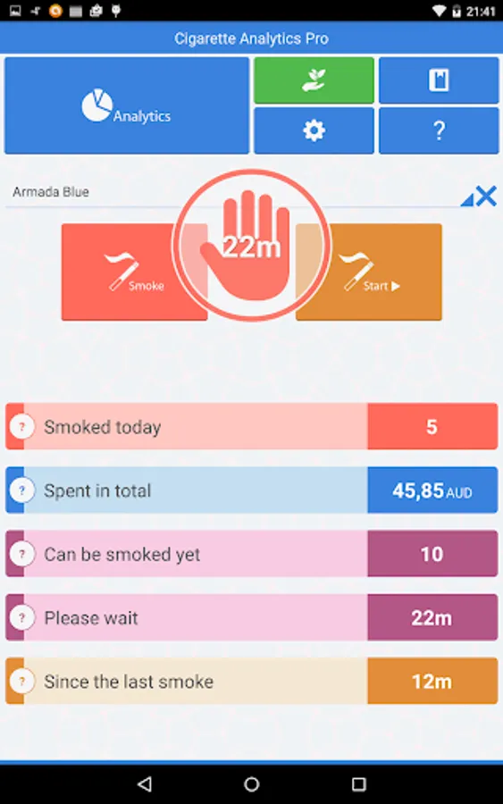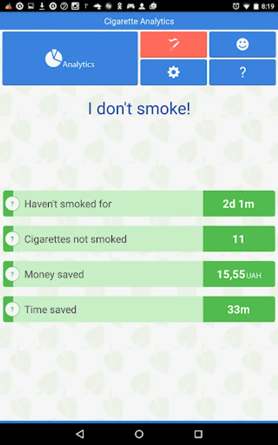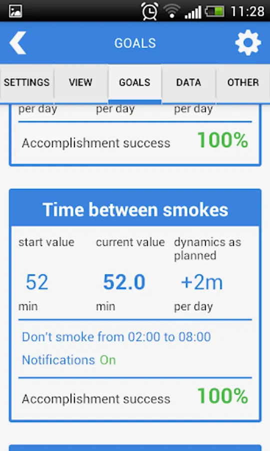 Goal section allows to set cigarettes day limit, minimum time between smokes and planned smoking quit date. Goals will help you to quit this habit step by step. Notification system will inform you on the possibility of smoking a cigarette or on the moment when you finally need to quit smoking.
