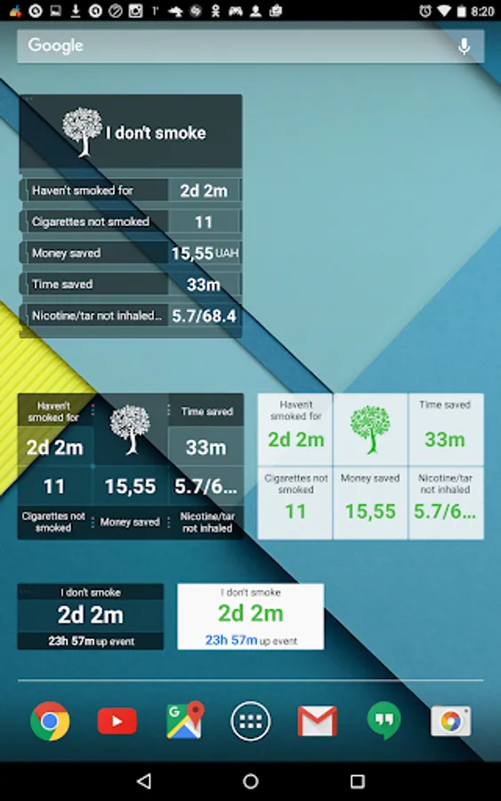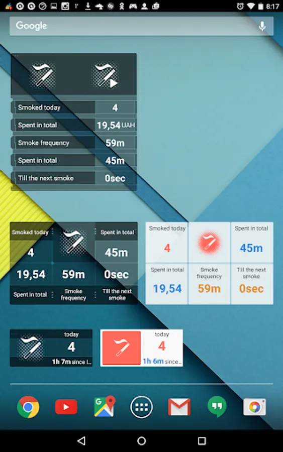 Both widgets interact with the set goals and will help you to control smoking according to your needs.