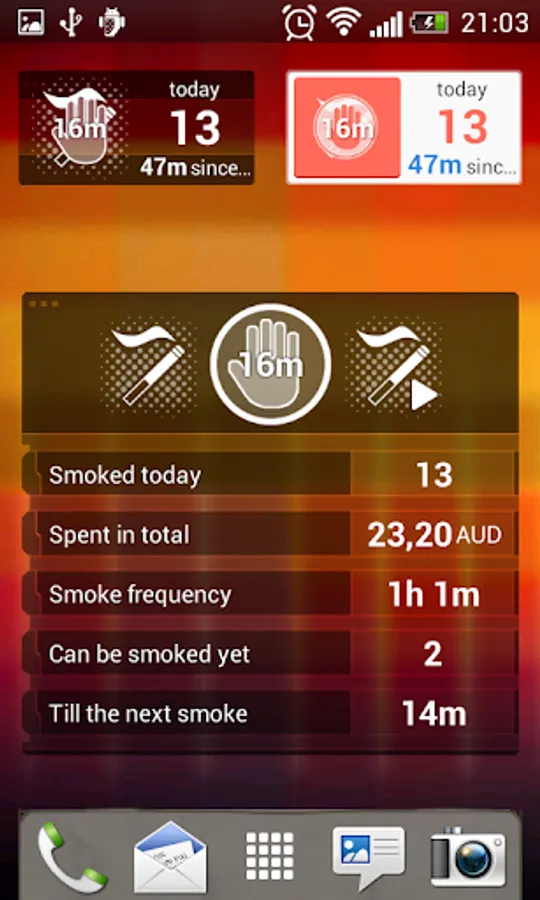 Simple widget allows to list a smoke without opening the main application, displays an amount of smoked cigarettes per day and time passed from the latest smoke.