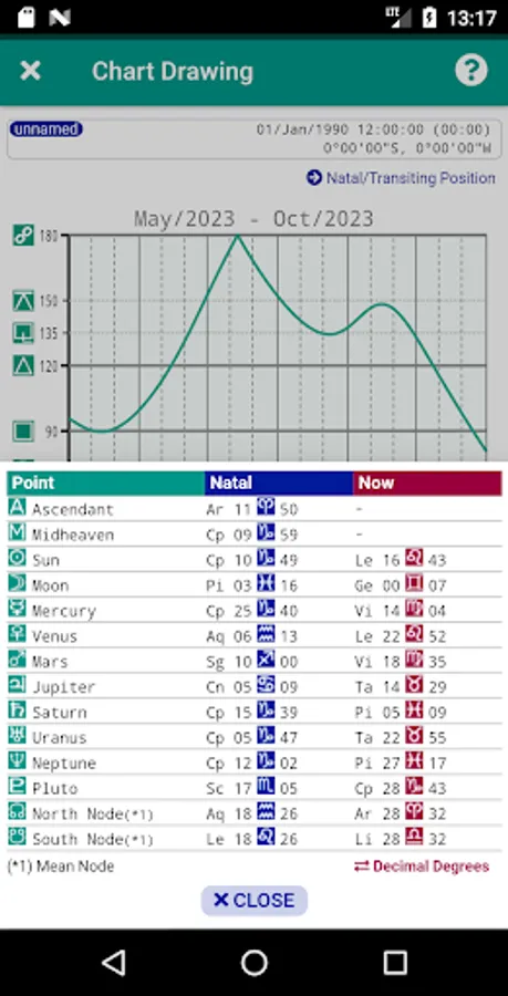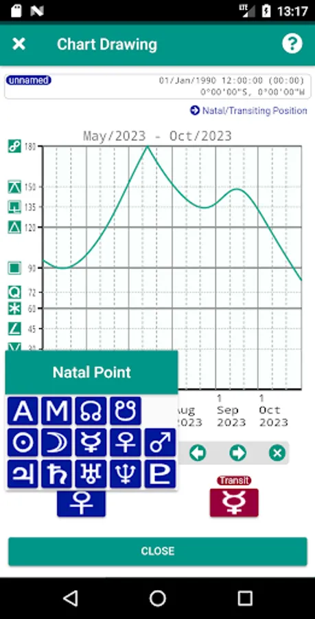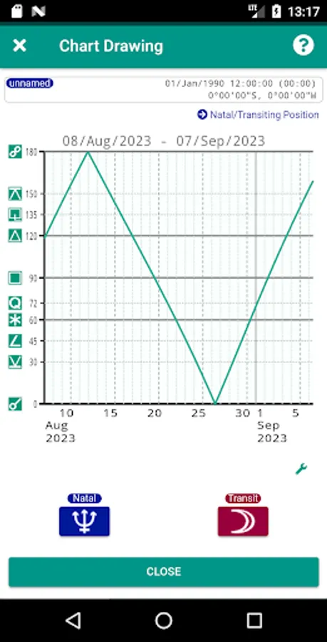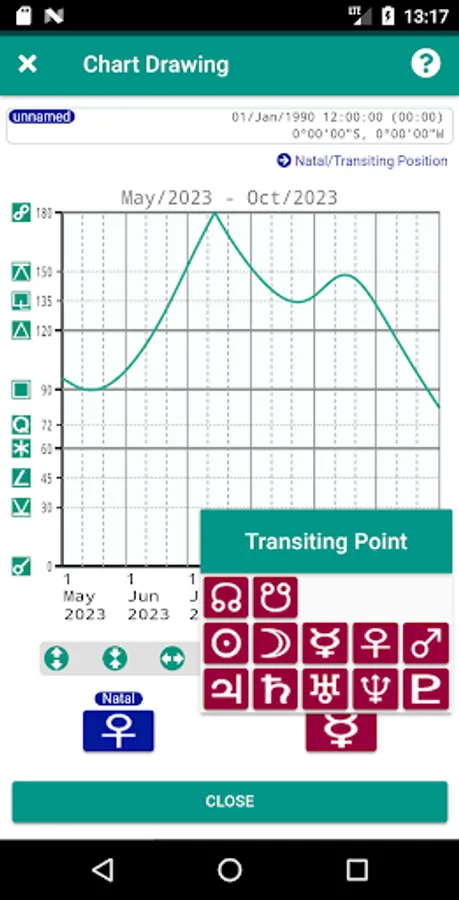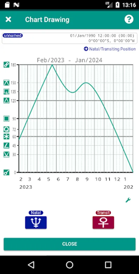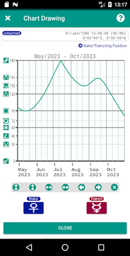 - The changing of the aspect between the selected natal object and the selected transiting object is charted.