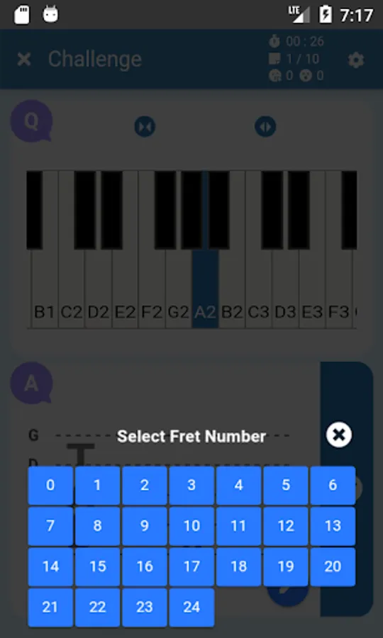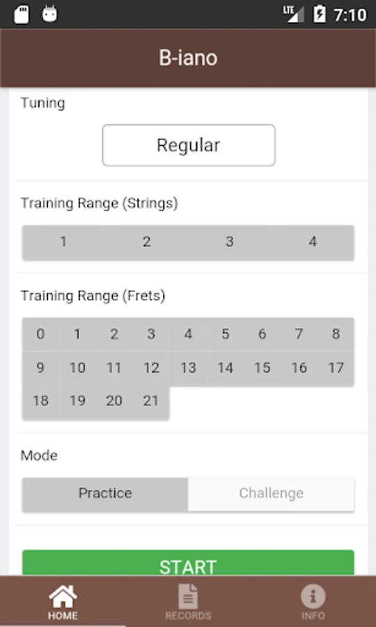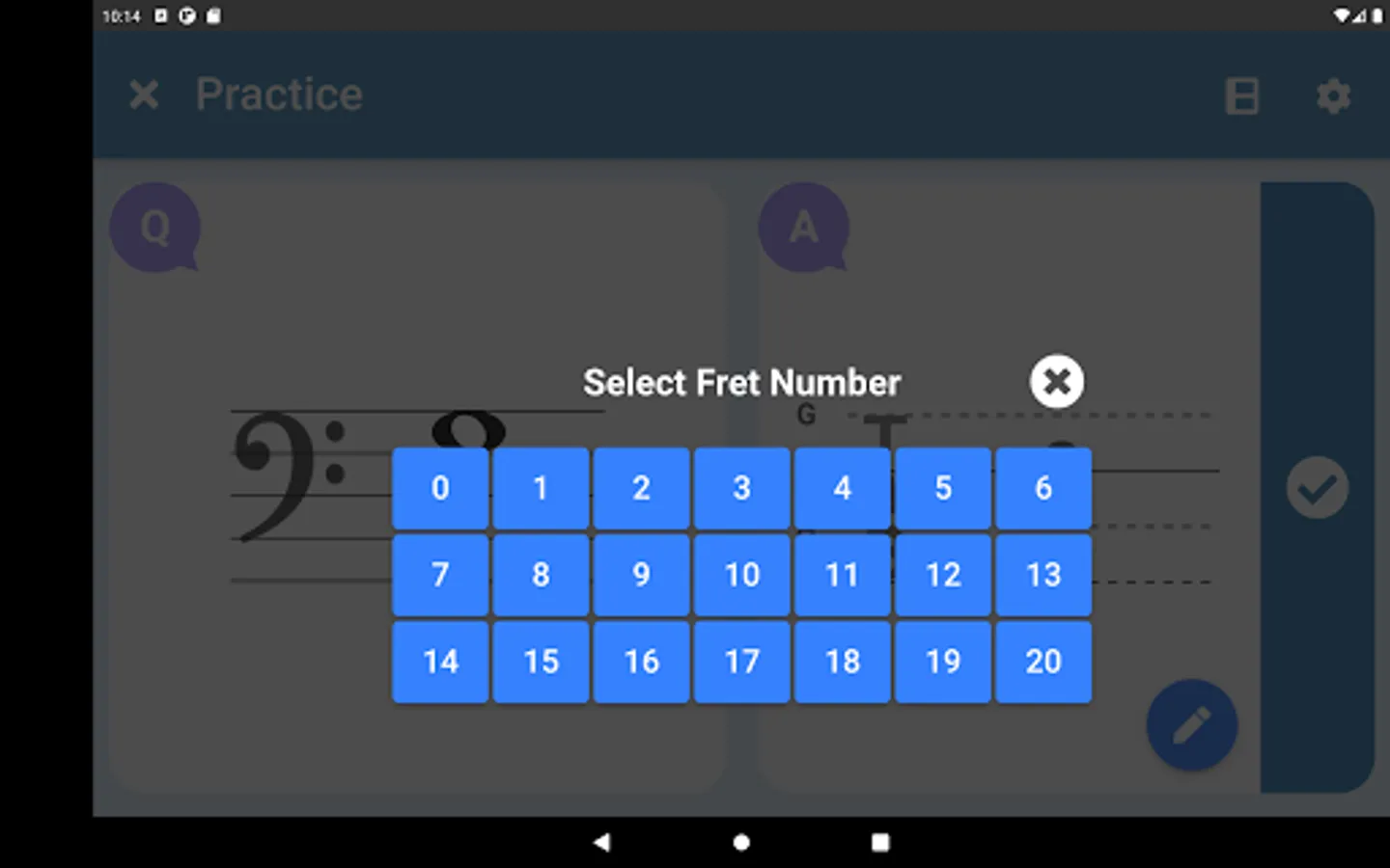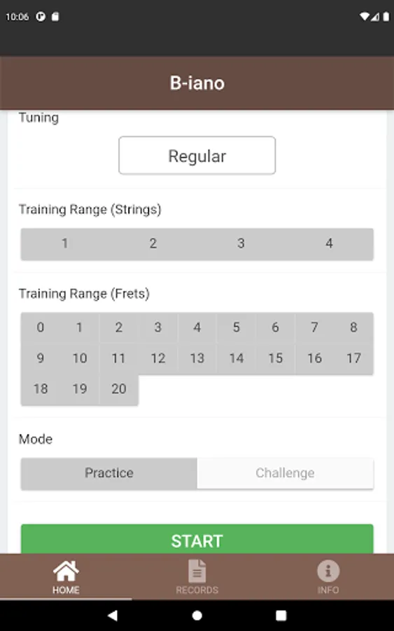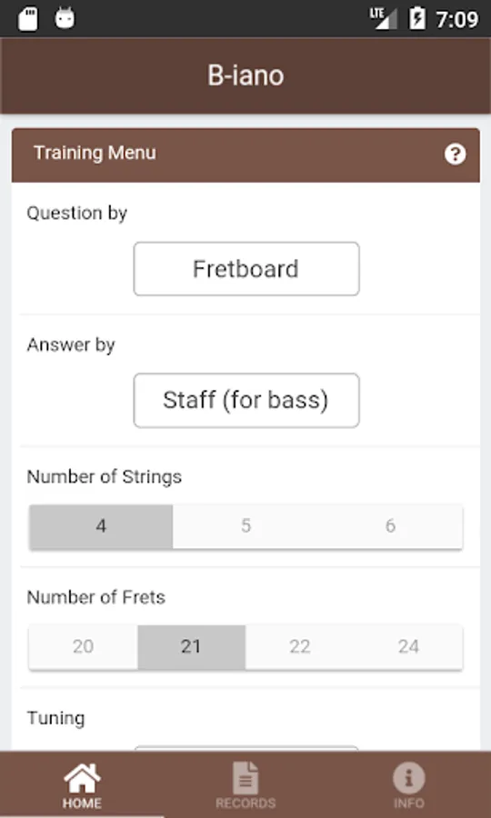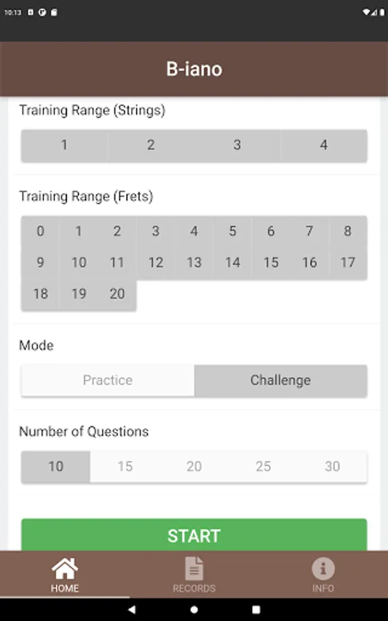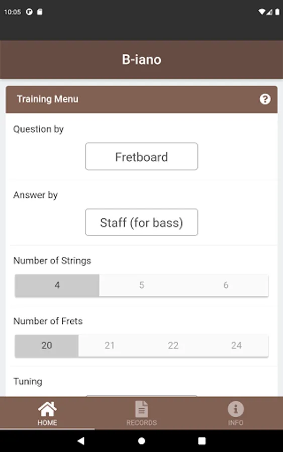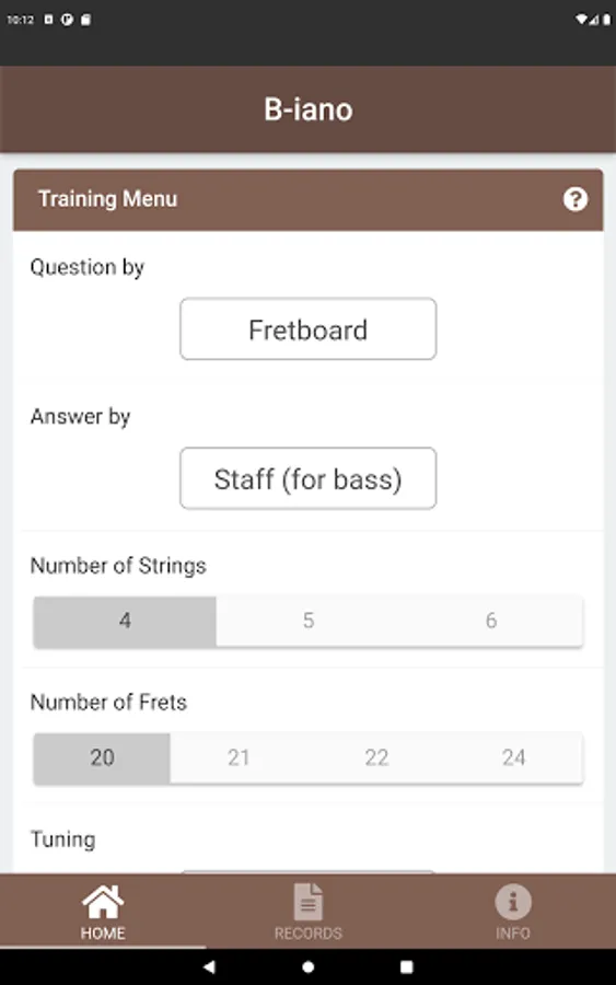 You can choose the number of strings, the number of frets, and tunings, as well as the range of strings and frets to be trained on.