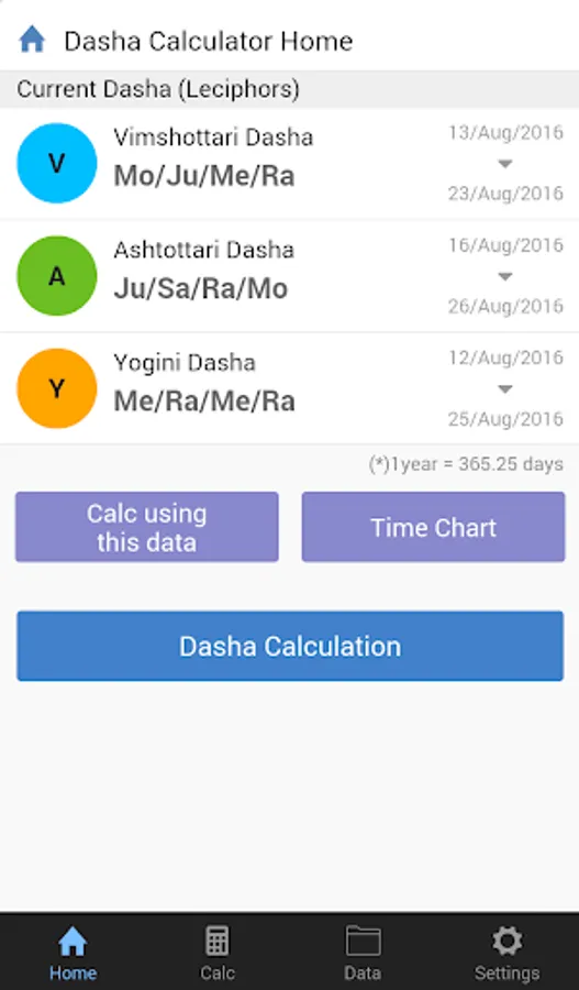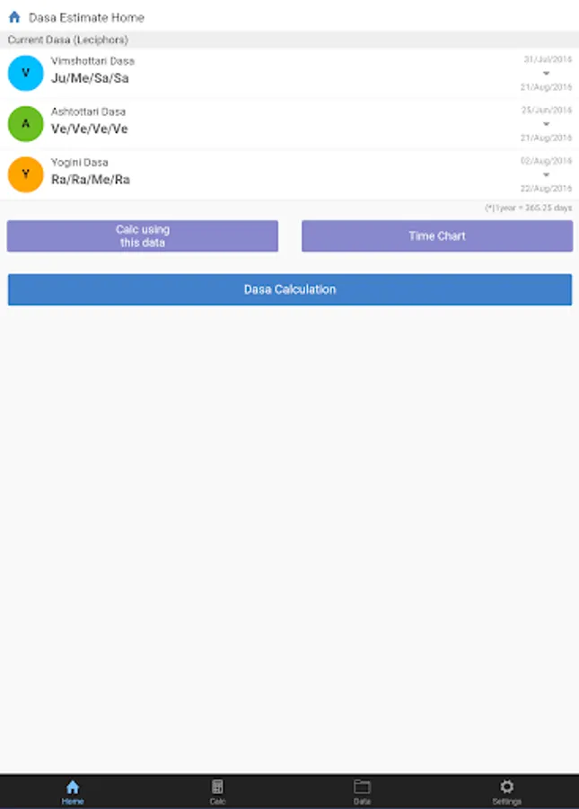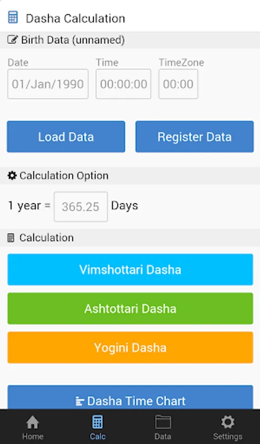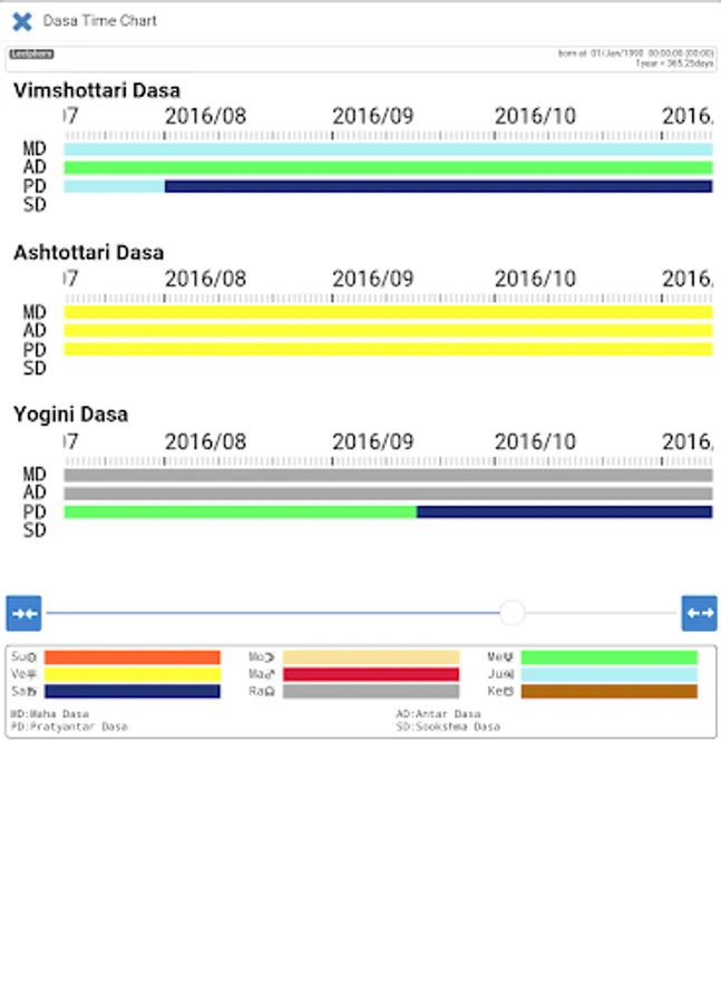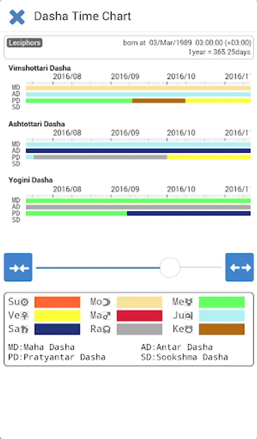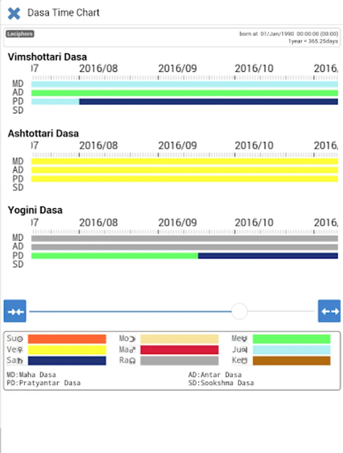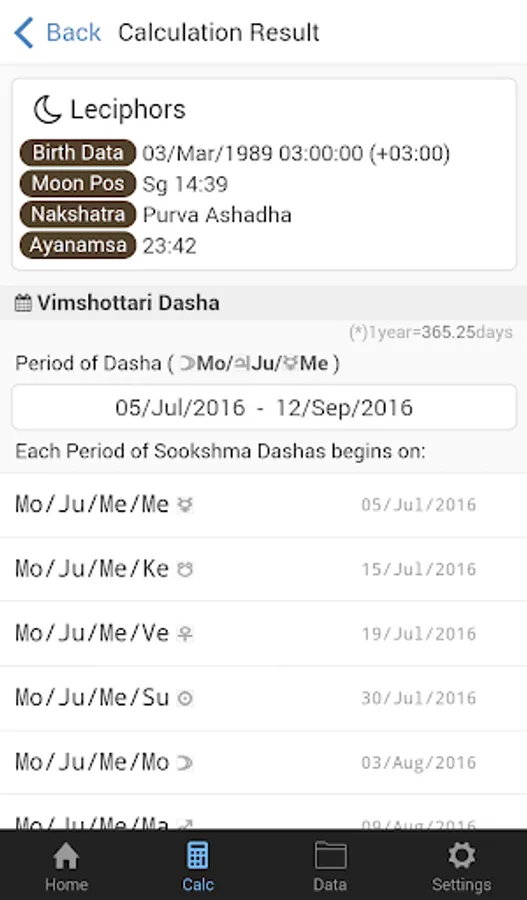 - calculates the each Dasha period using the input data (birth date, birth time, time zone) .