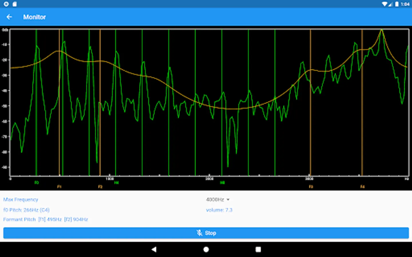 - Numerical display of formant frequencies (f1, f2)