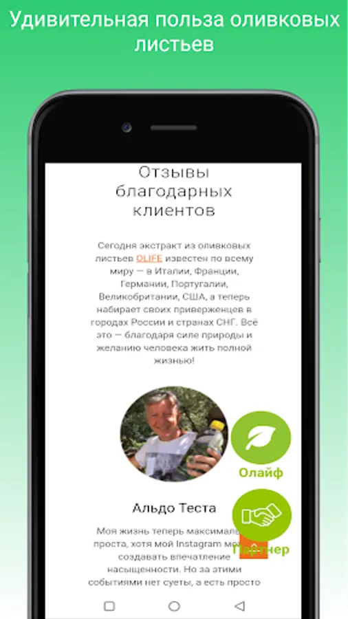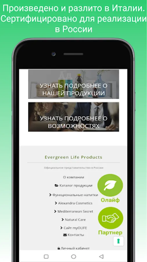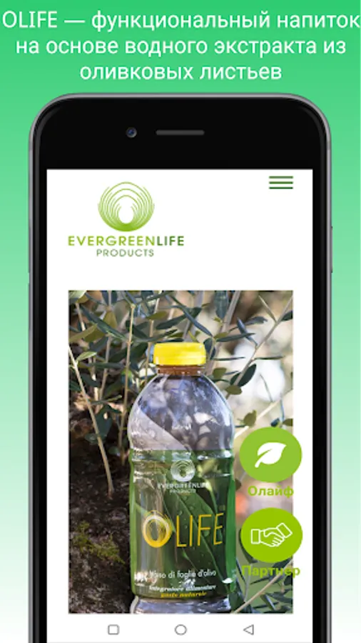 The products of the Italian company Evergreen Life Products are now officially in Russia. OLIFE is a functional drink based on an aqueous extract of olive leaves. Produced and bottled in Italy. Certified for sale in Russia. The most powerful antioxidant. Without preservatives and dyes. Environmentally friendly product.