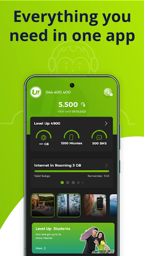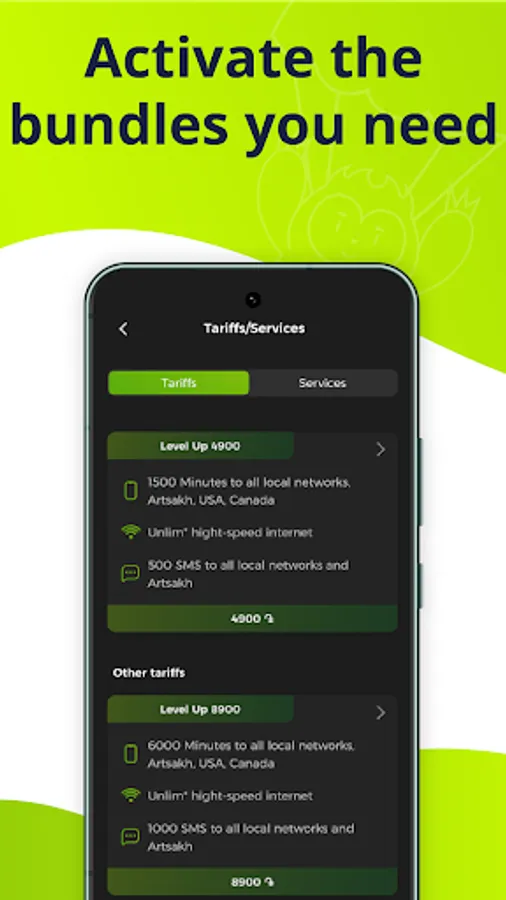 Everything you need in a single point. Forget about shortcodes. Activate bundles, check your inclusions, check or recharge your balance, switch to other tariff plans and activate roaming with a single touch.