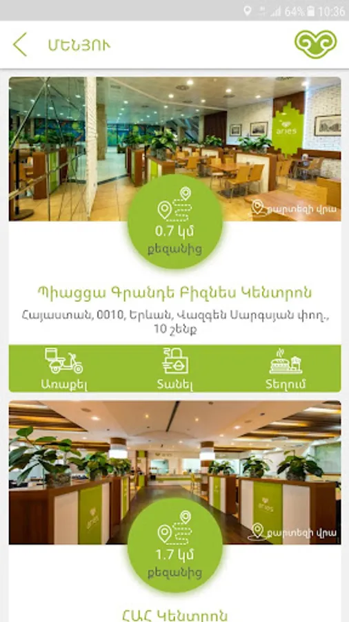 and we do our best to fit their wishes and to cater to their needs. Aries Lunch has three canteens: Piazza Grande Business Center (10 Vazgen Sargsyan), AUA Business Center ( 9 Alek Manukyan), American University of Armenia ( 40 Baghramyan ) .