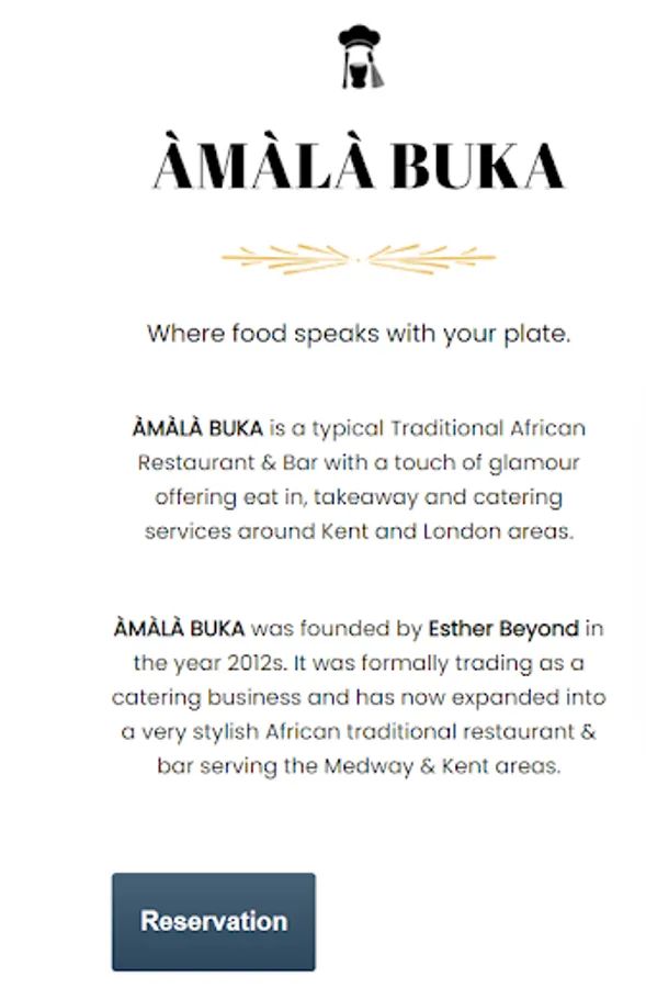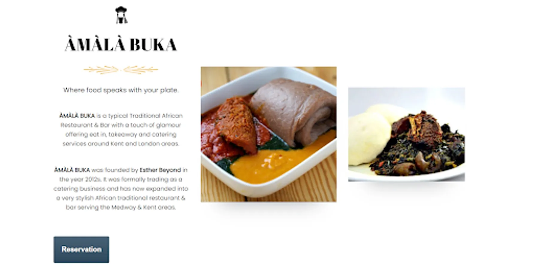 ÀMÀLÀ BUKA was founded by Esther Beyond in the year 2012. It was formally trading as a catering business and has now expanded into a very stylish African traditional restaurant & bar serving the Medway & Kent areas.