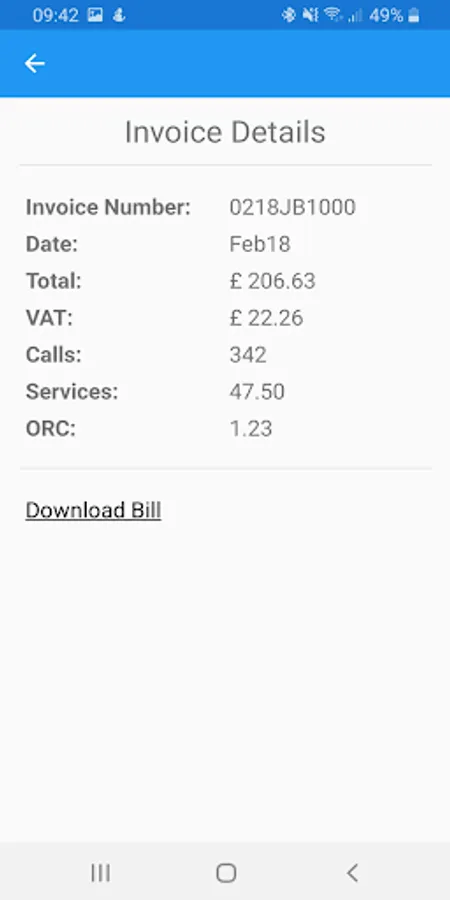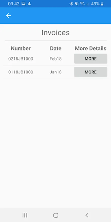 Application allowing the user to view a list of their most recent invoices based upon the invoice number and date the invoice was issued. The application provides a detailed view of the invoice, showing all relevant information.