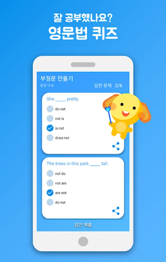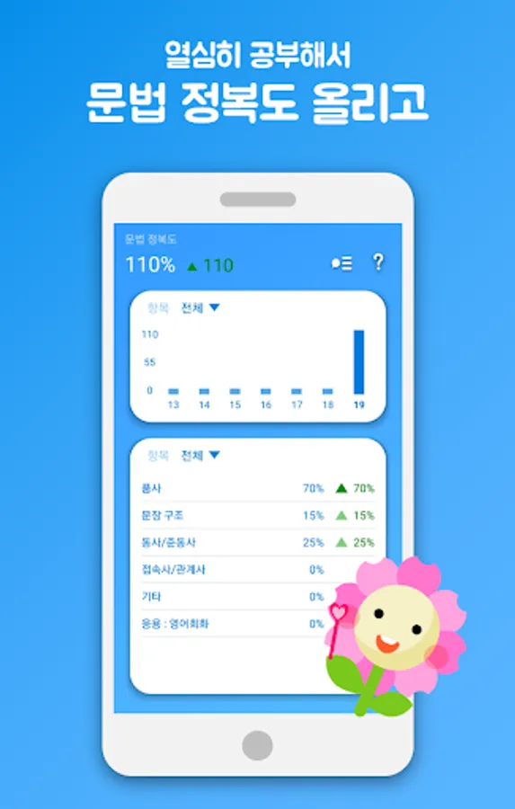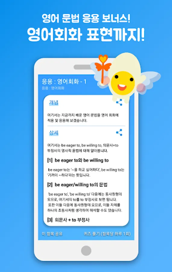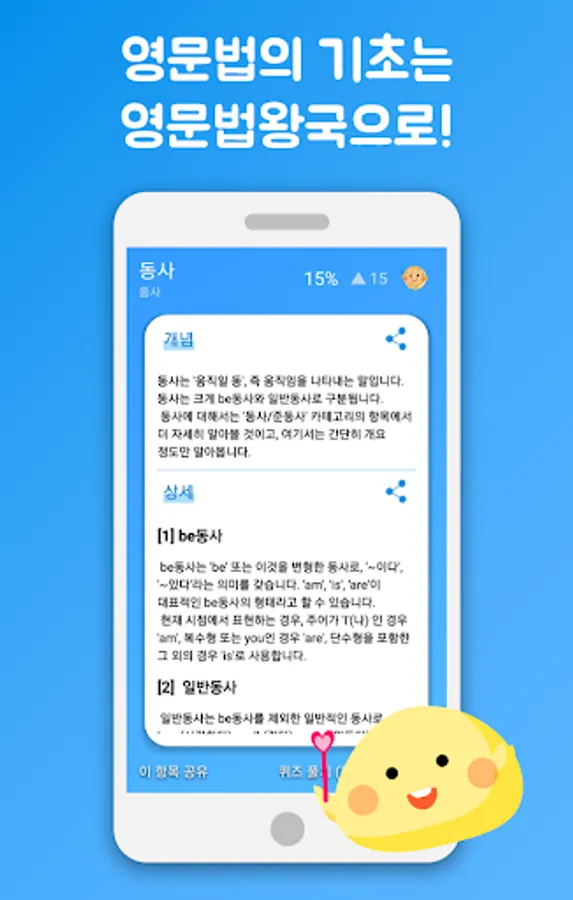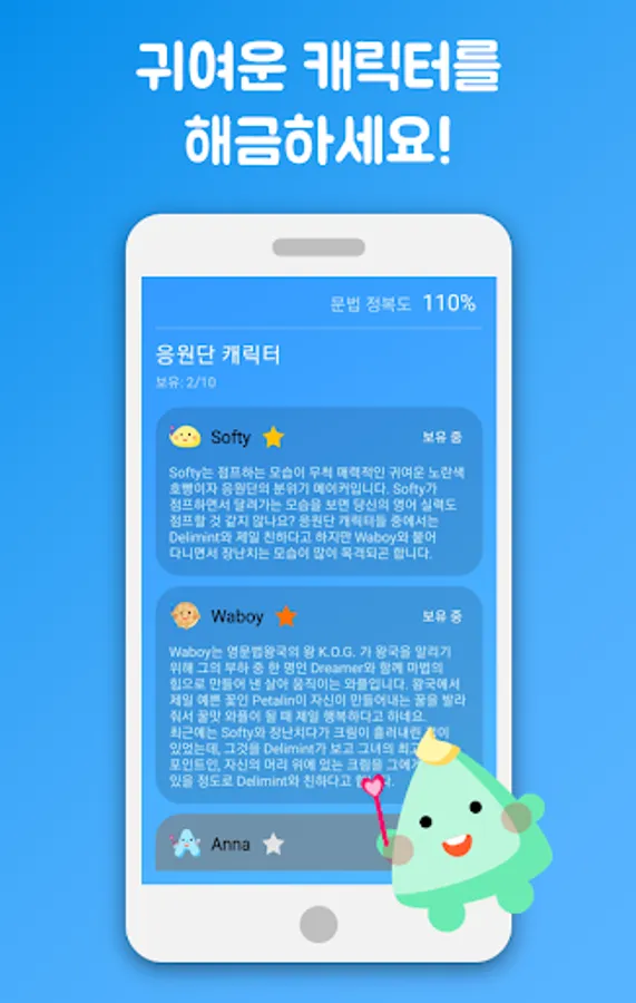 English Grammar Kingdom is an app that lets you learn English grammar happily while increasing your grammar conquest score with cute characters.