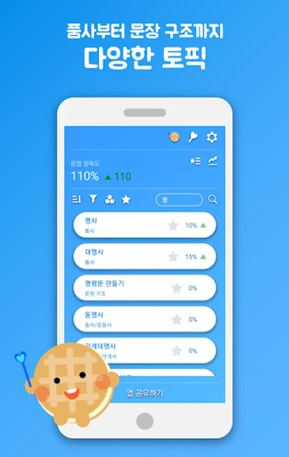 A quiz is prepared for each topic (item). Unlock various characters by solving quizzes and increasing your score of grammar conquest!
