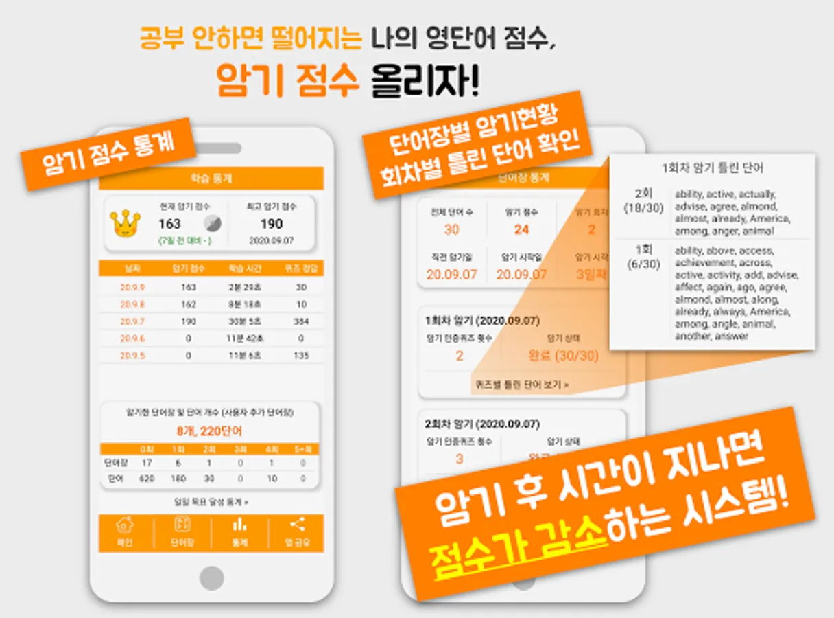 - 암기하면 오르지만 시간이 지나면 줄어든다! 그래서 공부자극 뿜뿜! "단어 암기 점수"