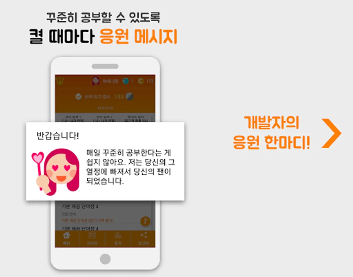 - 공부하기 힘들죠? 앱을 "켤 때마다 캐릭터가 응원" 해 줍니다.