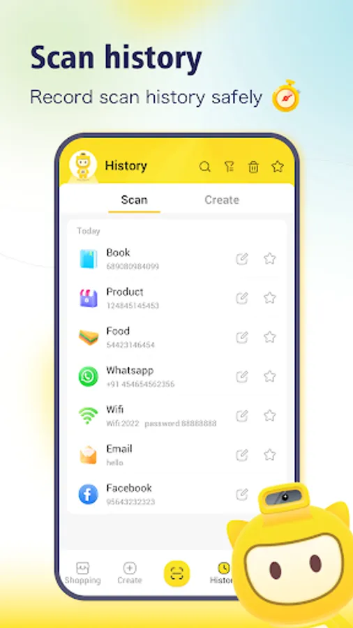 A record of all scanned and created QR codes is permanently saved, and the history list makes it easy to manage and clear the history of visited locations and QR code links.