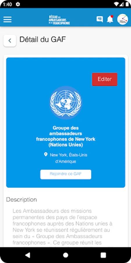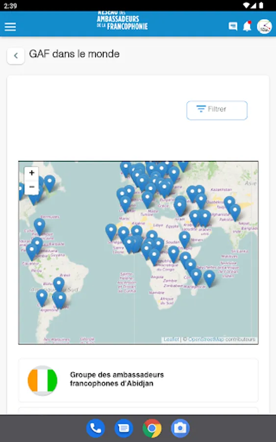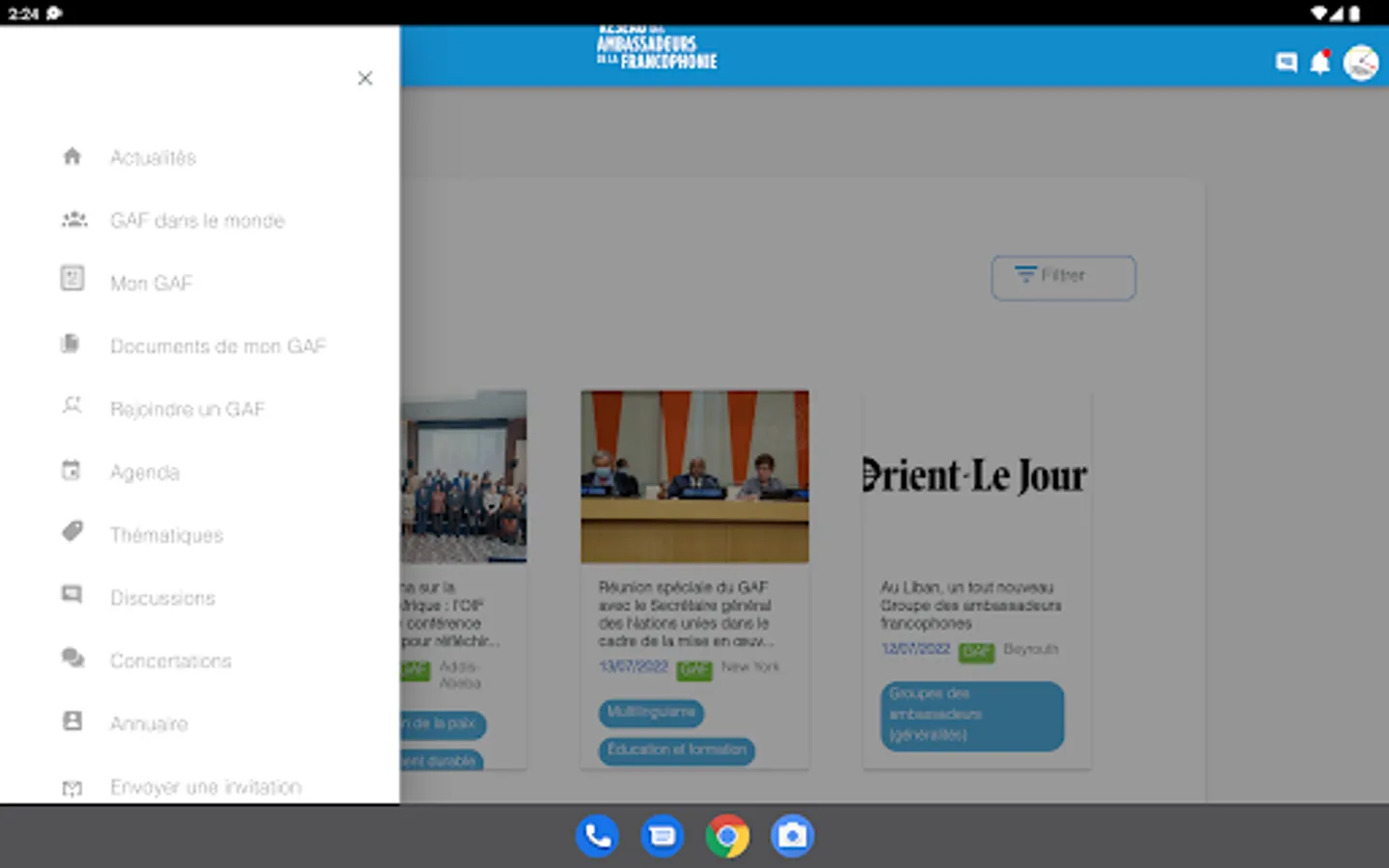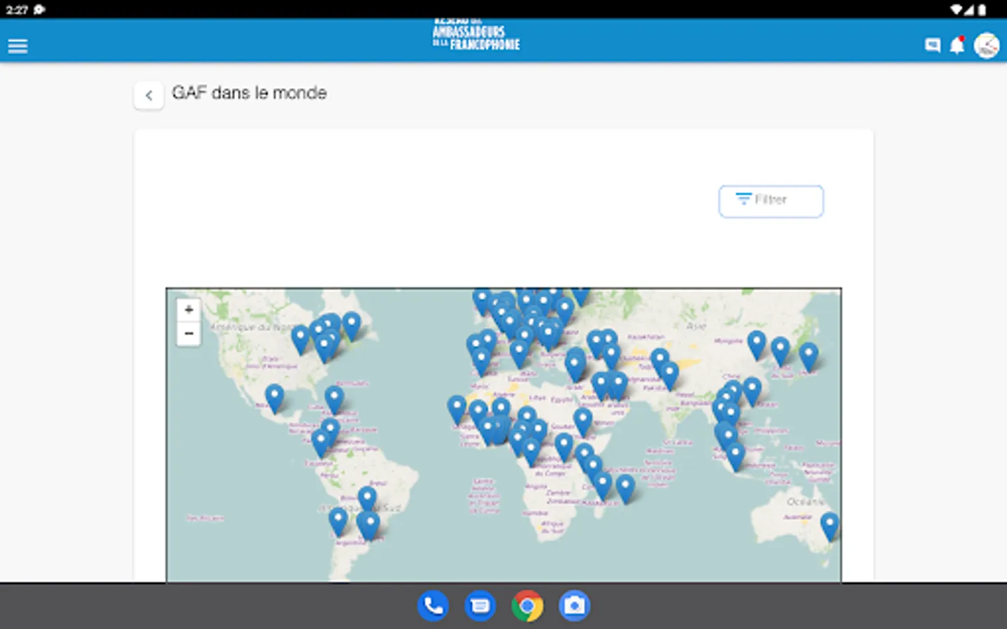 Developed by the International Organization of La Francophonie (OIF), this application aims to facilitate the networking of groups of French-speaking ambassadors (GAF) and to increase exchanges and consultations between the French-speaking diplomatic community. The application is specially intended for ambassadors and diplomats representing a state or government that is a member of La Francophonie. Access to the application is by invitation or by cooptation.