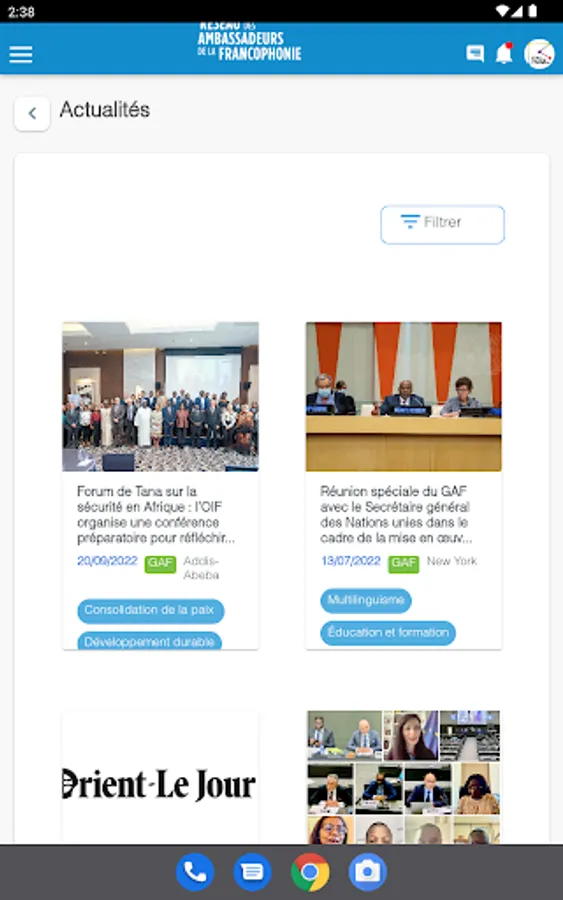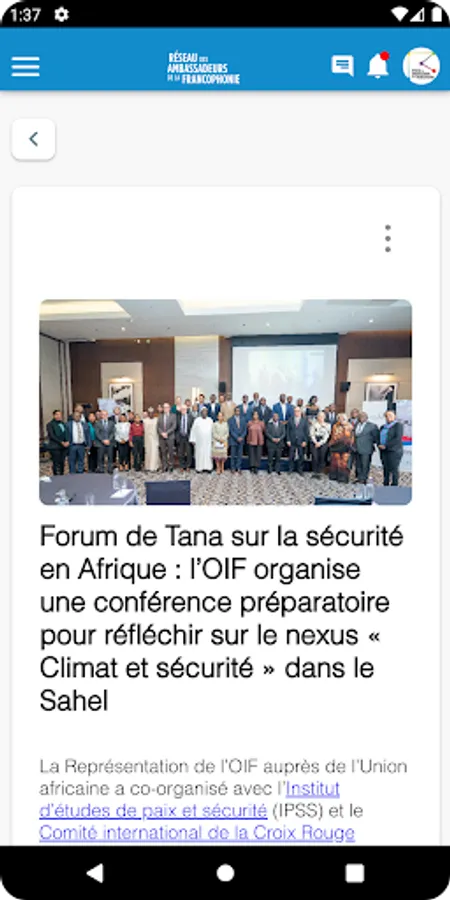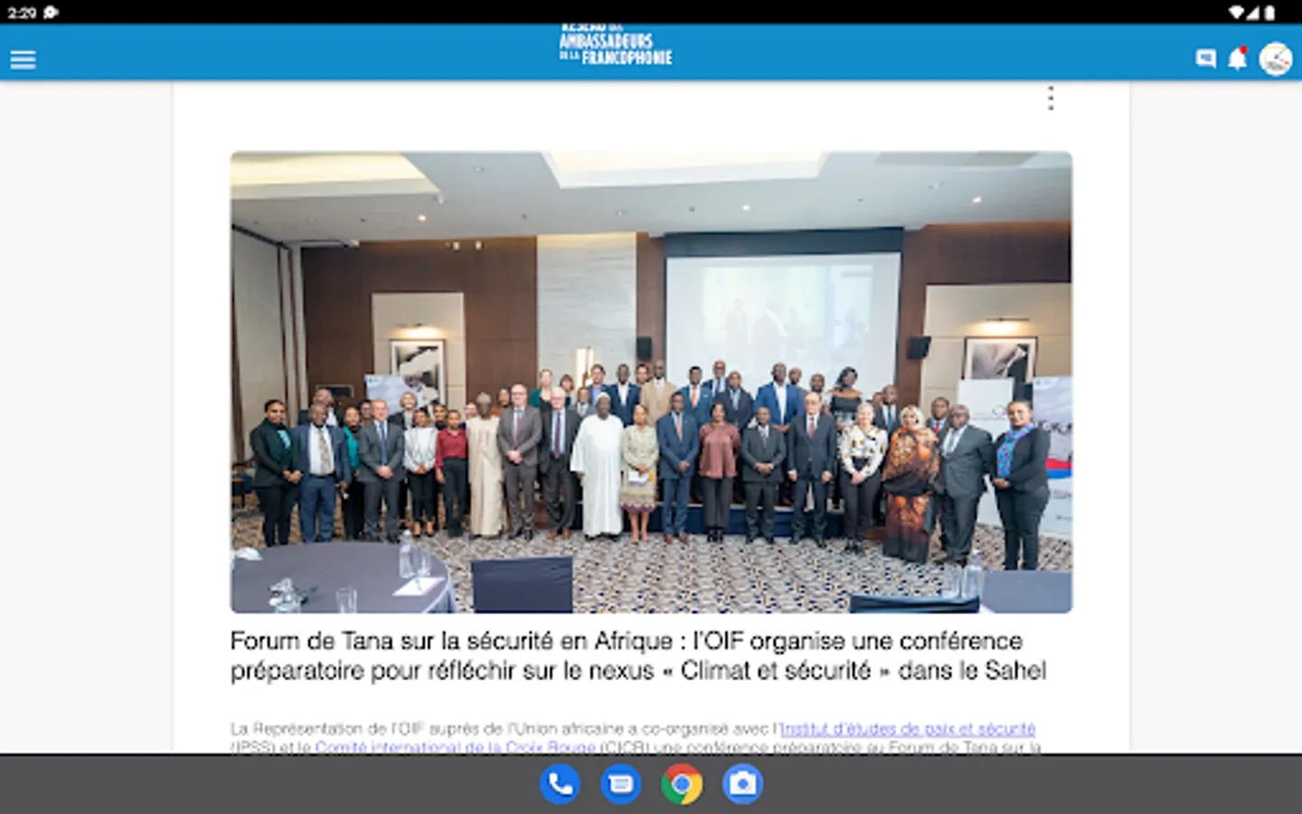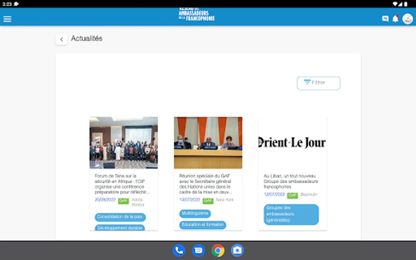 Developed by the International Organization of La Francophonie (OIF), this application aims to facilitate the networking of groups of French-speaking ambassadors (GAF) and to increase exchanges and consultations between the French-speaking diplomatic community. The application is specially intended for ambassadors and diplomats representing a state or government that is a member of La Francophonie. Access to the application is by invitation or by cooptation.