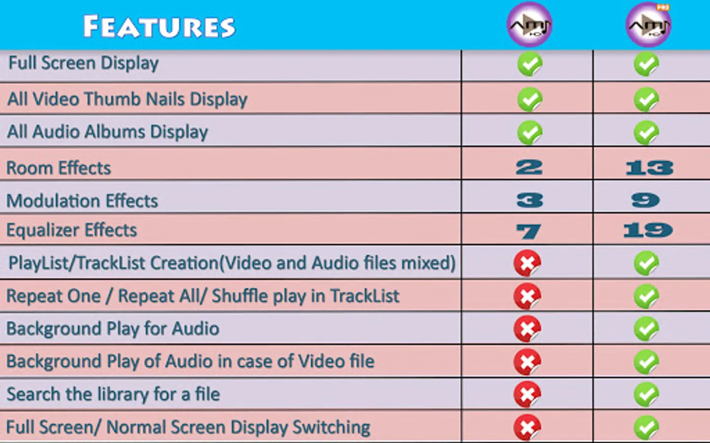 AMI Player Pro is an Advanced Media Impresa Player of Video and Audio. It is the first ever video player which gives different audio post processing effects for any video. Almost 19 audio effects, 9 voice effects and 13 convolution reverb effects are available. Same effects work with audio only playback as well. It gives excellent listening experience on Phones and Tablets. It comes with attractive and easy media player UI to apply different effects on any video/audio playback. It gives Volume Booster of 5dB extra on maximum allowed volume of the device.