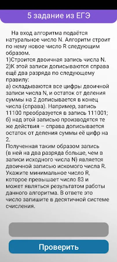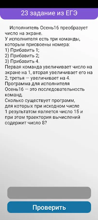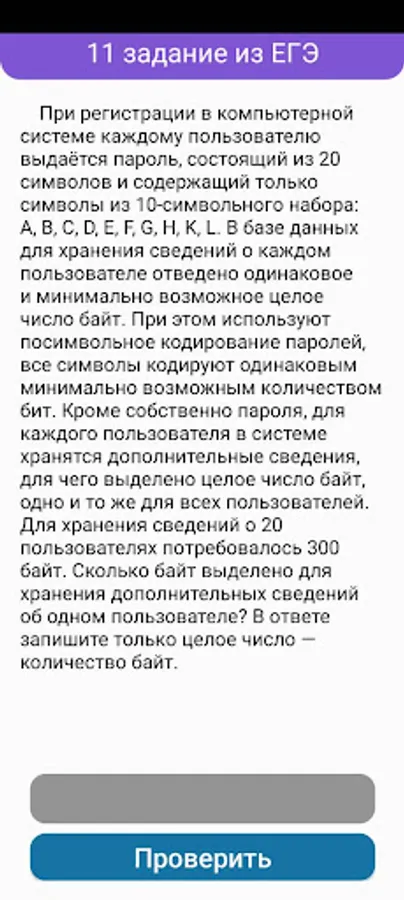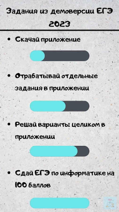 The application is designed to prepare for the unified state exam (USE) in computer science. The application includes tasks similar to tasks from the USE 2023 demo version. You can solve the tasks individually or solve the whole option and find out your result.