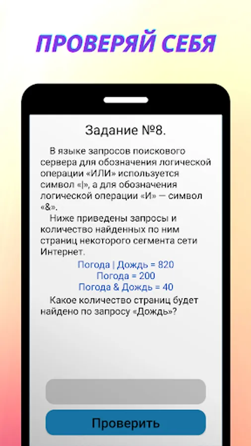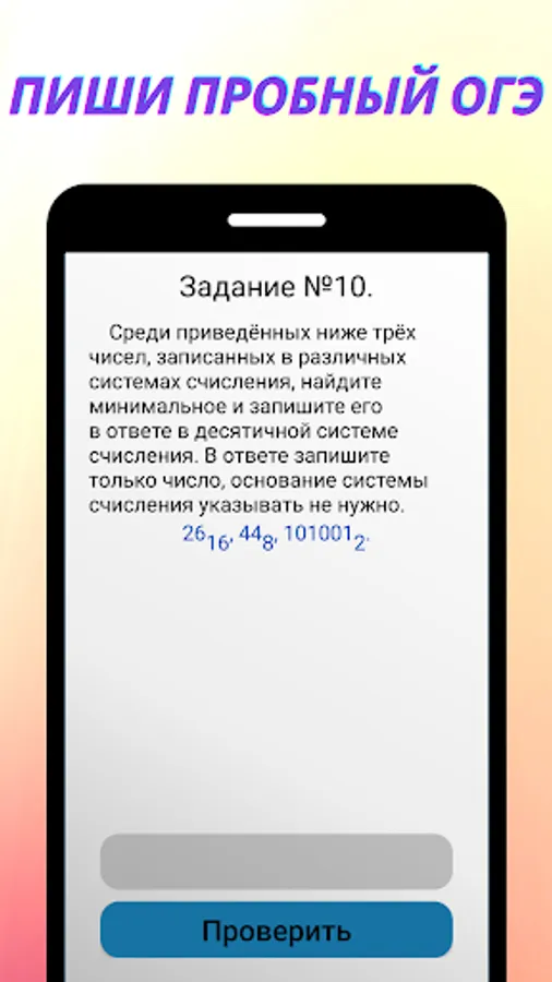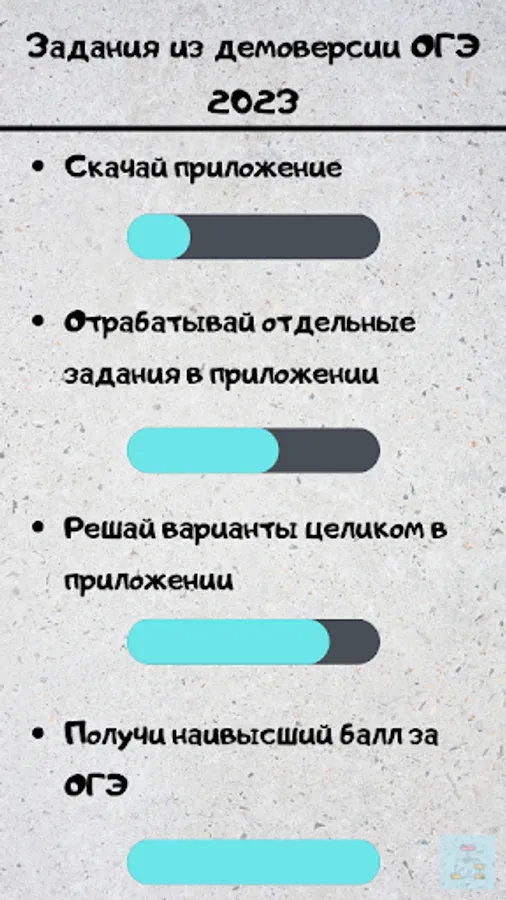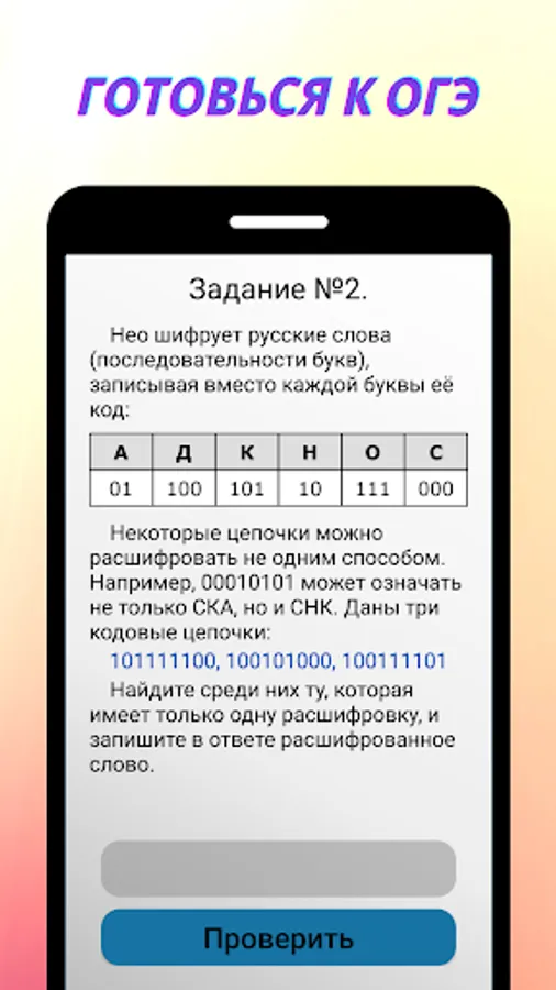The application is designed to prepare for the main state exam in computer science. The application includes tasks similar to tasks from the demo version of the OGE 2023. You can solve the tasks individually or solve the whole option and find out your result. Registration is available on the app. For registered users, the ability to save the results in an account is available.