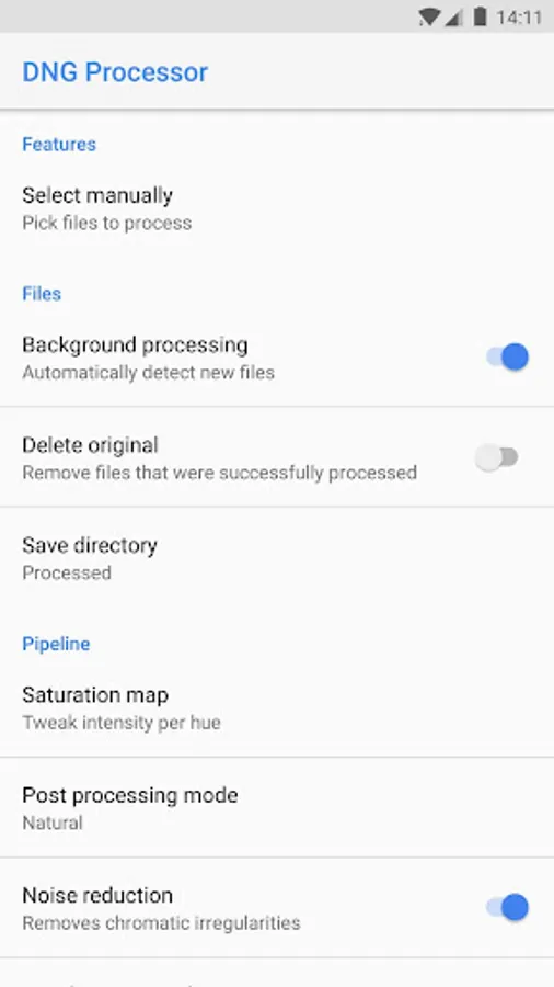 DNG Processor waits for new RAW images captured using a supported camera app, and then processes them in the background. It does this by using the power of your phone's graphics unit for up to a few seconds. The results have more details, higher dynamic range, and can improve over time when the application gets updated. No set-up required!