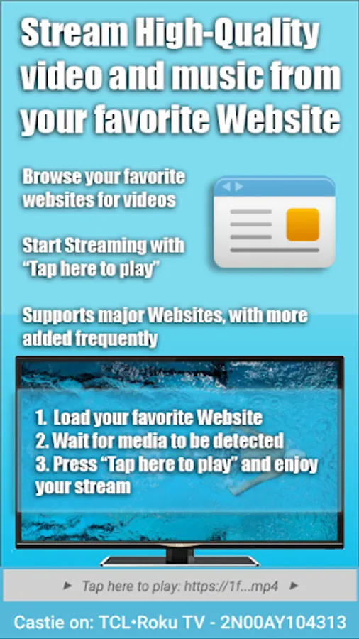With Castie you may browse the web and stream any video or music you desire directly to your Roku device. Simply navigate to your favorite website and "tap here to play" the detected media. You may also use your local networks DLNA / Upnp or Samba folders to stream and cast media.