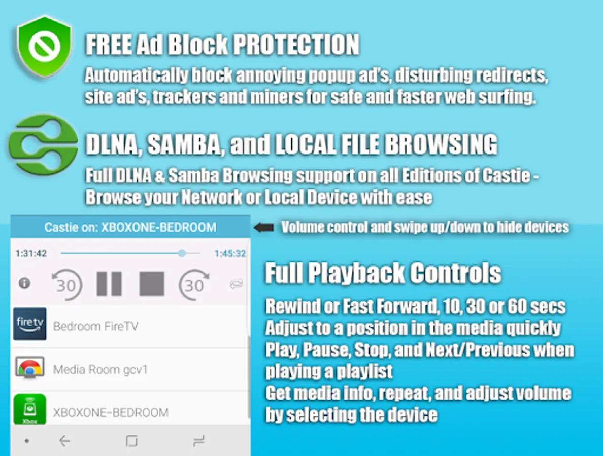 * Security Note: For your safety Castie includes a FREE built-in AD Blocker and uses minimal Android permissions unlike other applications that charge for AD blocking, or require many un-needed permissions. Please beware of other apps that access too many permissions or charge for features that keep you safe.