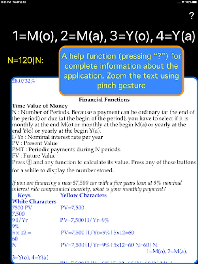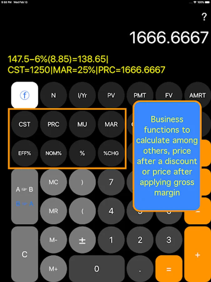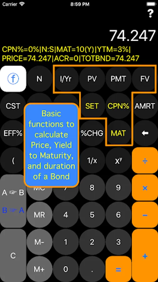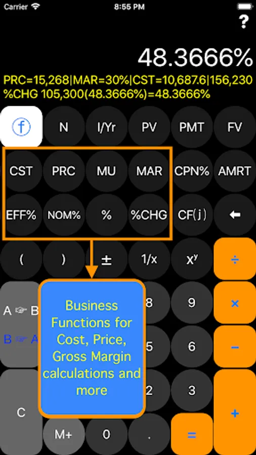 Calculator with arithmetic functions, business, financial and statistical functions, equation solver and metric conversion. It allows you to work with price, cost, markup, margin, time value of money and loan amortization. It also calculates net present value, internal rate of return in Cash Flow. Bonds price, yield to maturity and Macaulay duration of a bond. You will also be able to calculate standard deviation, regression and correlation of data sets in its statistical component and solve equations up to 4th degree. With the conversion component you can make operations with dates and also convert temperature, weight, volume and some other useful conversions.