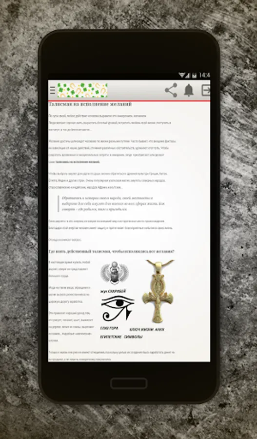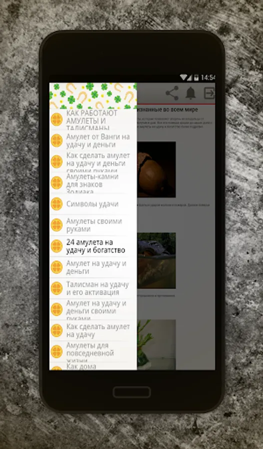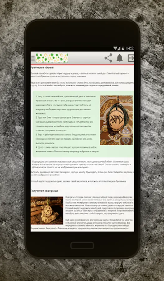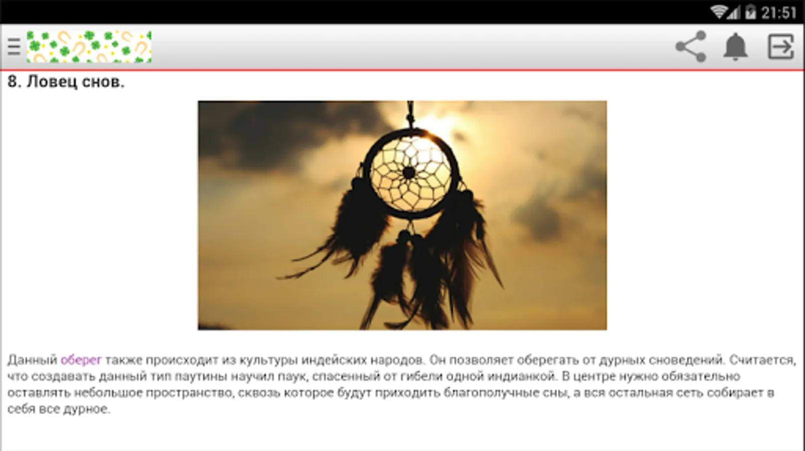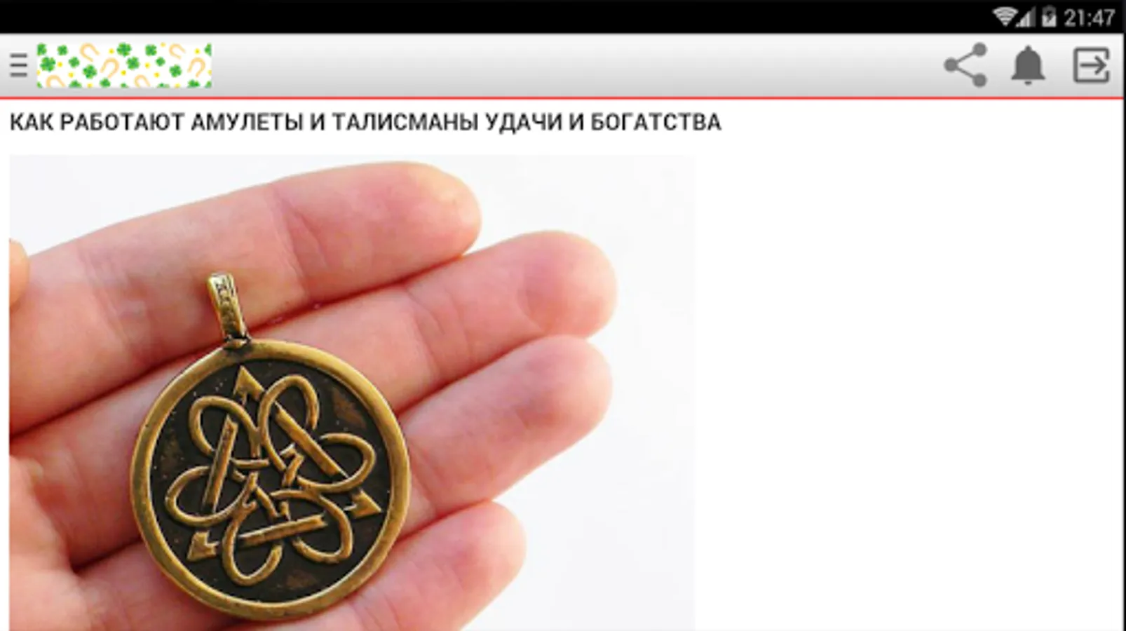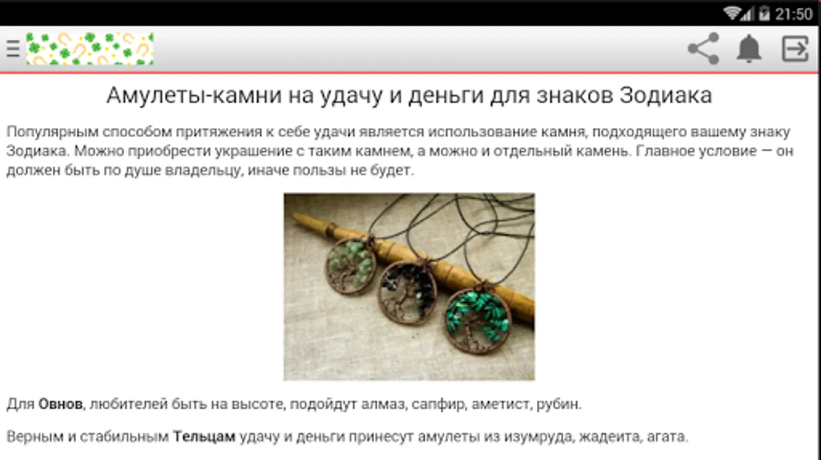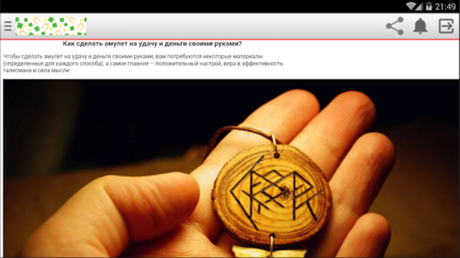 The application "Amulets and charms for good luck" will help you bring luck into your life and tell you about ways to protect against negative energy and bad events. In it you will find information about what charms there are and how to make amulets with your own hands. Charms amulets and charms are strong defenders. And if it seems to you that a black stripe has come in your life, an amulet for good luck can cope with it.