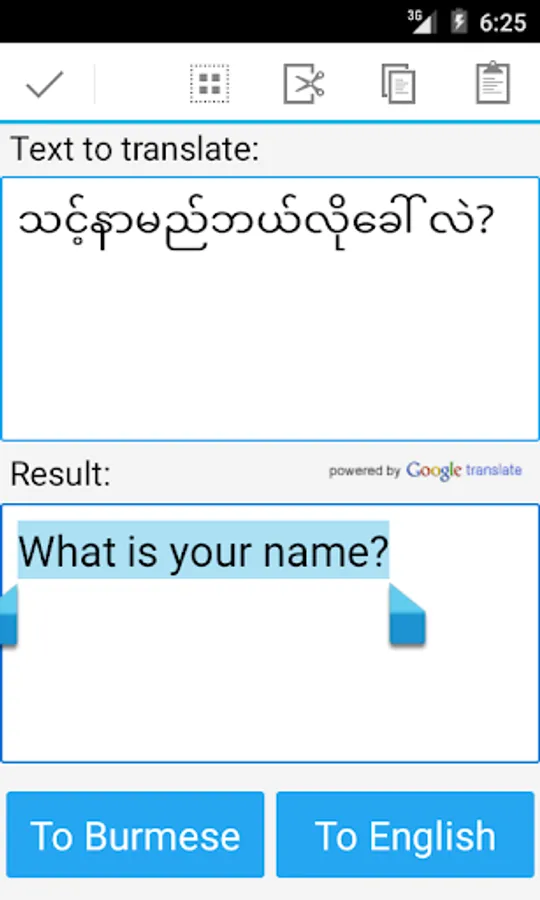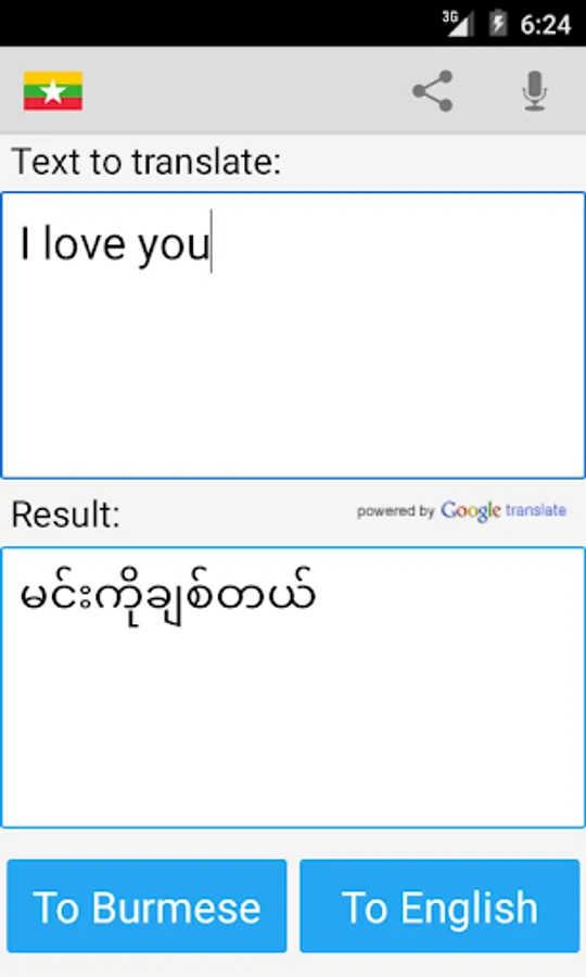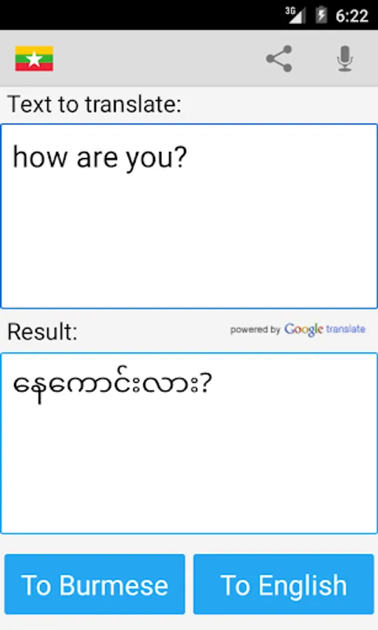 This free app is able to translate words and texts from english to burmese, and from burmese to english.