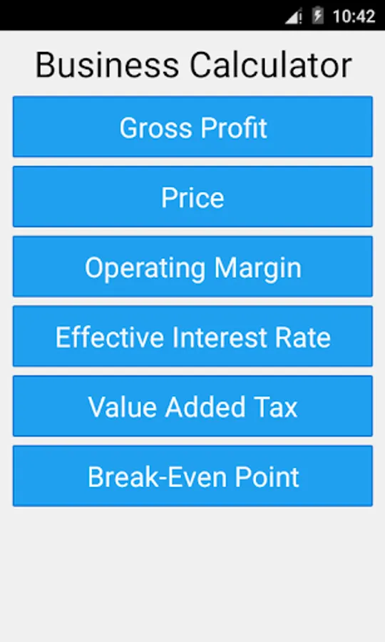 This app consists of a Gross Profit Calculator, Price Calculator, Operating Margin Calculator, Effective Interest Rate Calculator, Value Added Tax Calculator and a Break-Even Point Calculator.