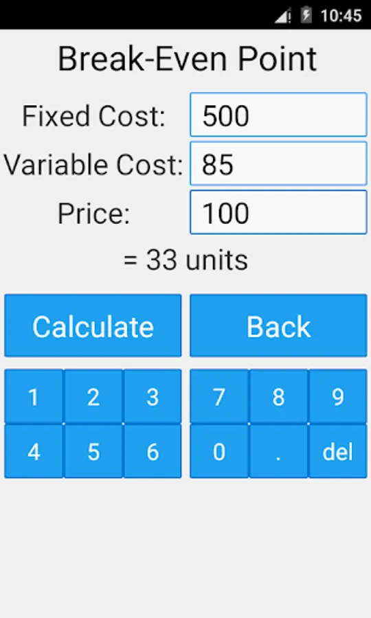 Break-Even Point: You are able to calculate the break-even point. Just enter fixed cost, variable cost and price of a unit.
